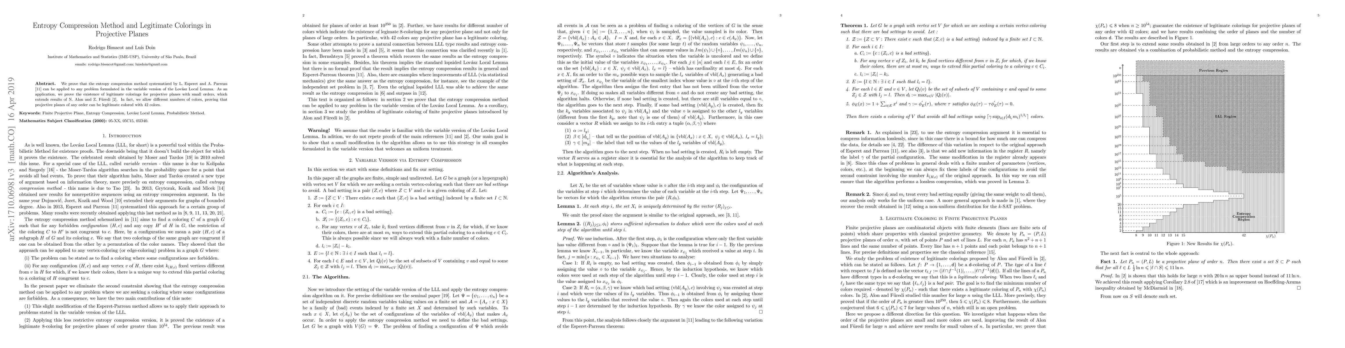 We prove that the entropy compression method systematized by L. Esperet and A. Parreau [11] can be applied to any problem formulated in the variable version of the Lov\'asz Local Lemma. As an application, we prove the existence of legitimate colorings for projective planes with small orders, which extends results of N. Alon and Z. F\"uredi [2]. In fact, we allow different numbers of colors, proving that projective planes of any order can be legitimate colored with 42 colors.
