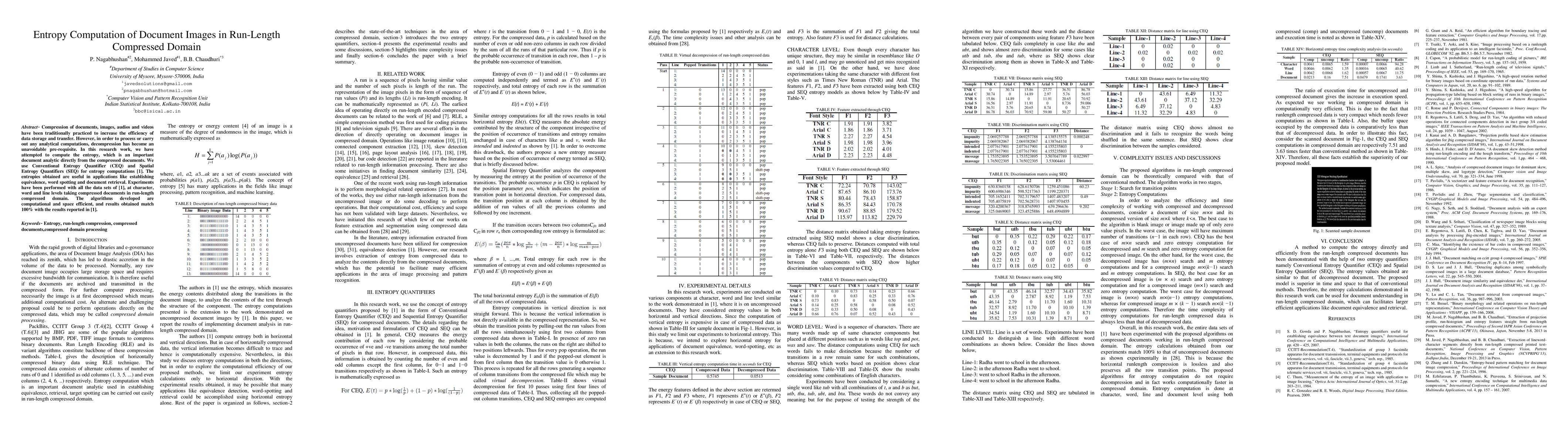 This paper proposes methods to compute entropy directly from run-length compressed document images, using Conventional Entropy Quantifier (CEQ) and Spatial Entropy Quantifiers (SEQ). The developed algorithms are computationally and space efficient, achieving 100% accuracy in entropy results compared to traditional decompression methods.