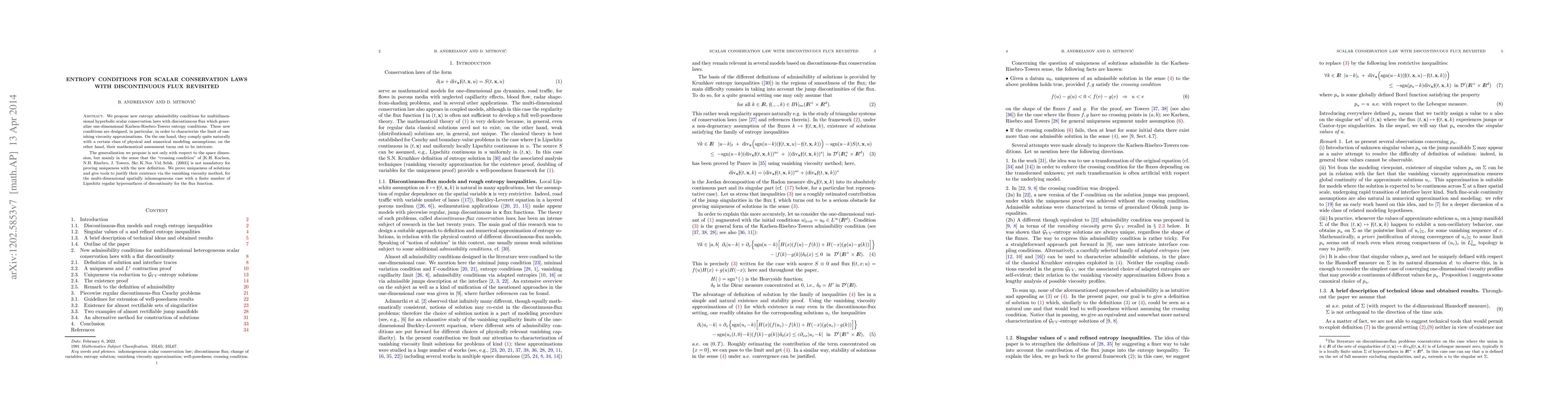 We propose new entropy admissibility conditions for multidimensional hyperbolic scalar conservation laws with discontinuous flux which generalize one-dimensional Karlsen-Risebro-Towers entropy conditions. These new conditions are designed, in particular, in order to characterize the limit of vanishing viscosity approximations. On the one hand, they comply quite naturally with a certain class of physical and numerical modeling assumptions; on the other hand, their mathematical assessment turns out to be intricate. \smallskip The generalization we propose is not only with respect to the space dimension, but mainly in the sense that the "crossing condition" of [K.H. Karlsen, N.H. Risebro, J. Towers, Skr.\,K.\,Nor.\,Vid.\,Selsk. (2003)] is not mandatory for proving uniqueness with the new definition. We prove uniqueness of solutions and give tools to justify their existence via the vanishing viscosity method, for the multi-dimensional spatially inhomogeneous case with a finite number of Lipschitz regular hypersurfaces of discontinuity for the flux function.