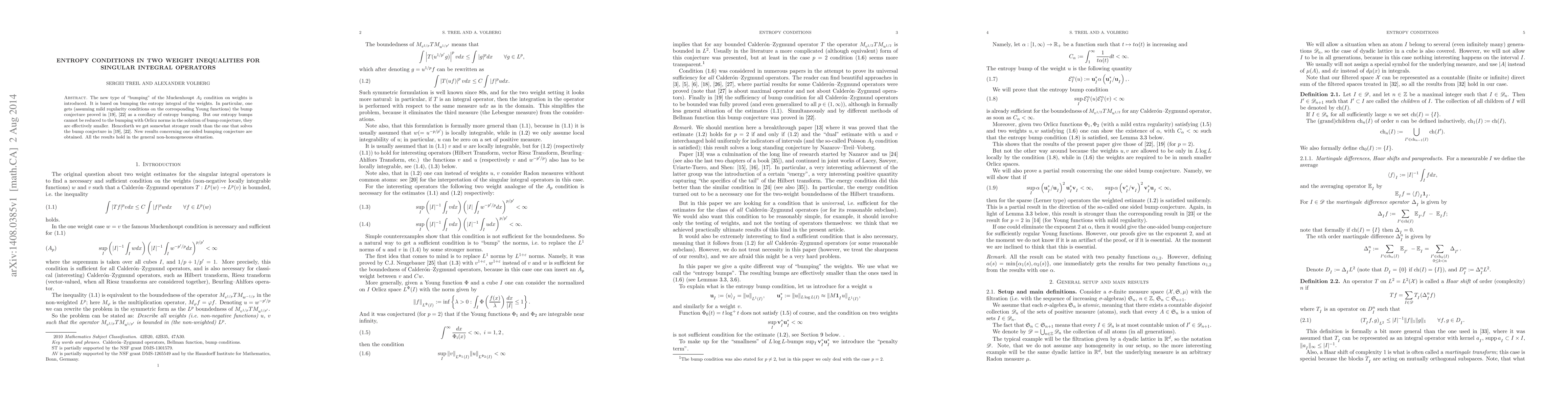 The new type of "bumping" of the Muckenhoupt $A_2$ condition on weights is introduced. It is based on bumping the entropy integral of the weights. In particular, one gets (assuming mild regularity conditions on the corresponding Young functions) the bump conjecture, proved earlier by A. Lerner and independently by Nazarov--Reznikov--Treil--Volberg, as a corollary of entropy bumping. But our entropy bumps cannot be reduced to the bumping with Orlicz norms in the solution of bump conjecture, they are effectively smaller. Henceforth we get somewhat stronger result than the one that solves the bump conjecture. New results concerning one sided bumping conjecture are obtained. All the results hold in the general non-homogeneous situation.