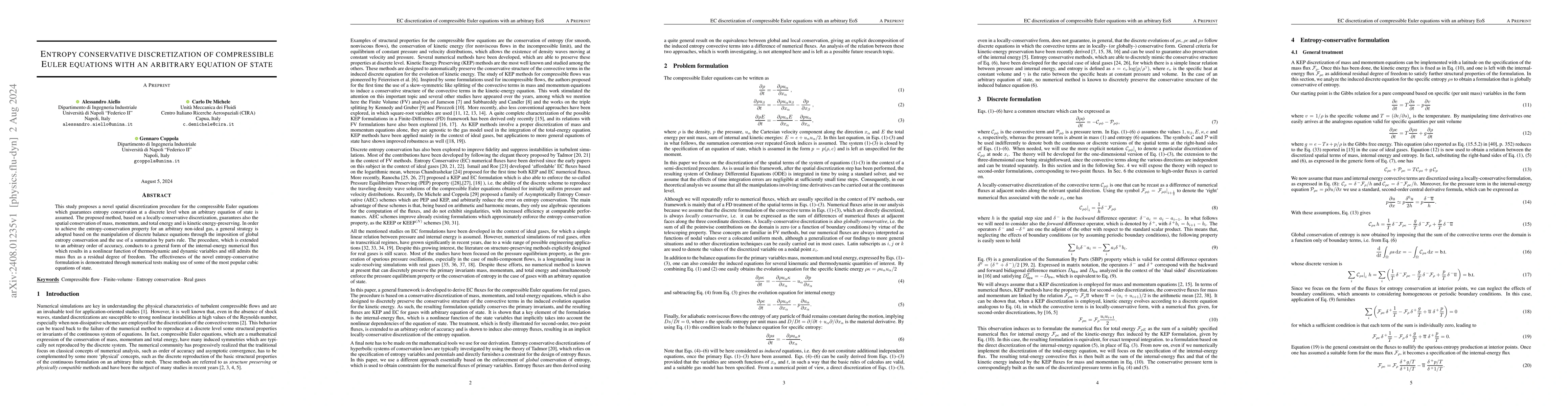This paper introduces a new entropy-conservative discretization technique for compressible Euler equations that accommodates any equation of state, ensuring conservation of mass, momentum, energy, and entropy through a summation by parts rule. Numerical tests validate its effectiveness using common cubic equations of state.
