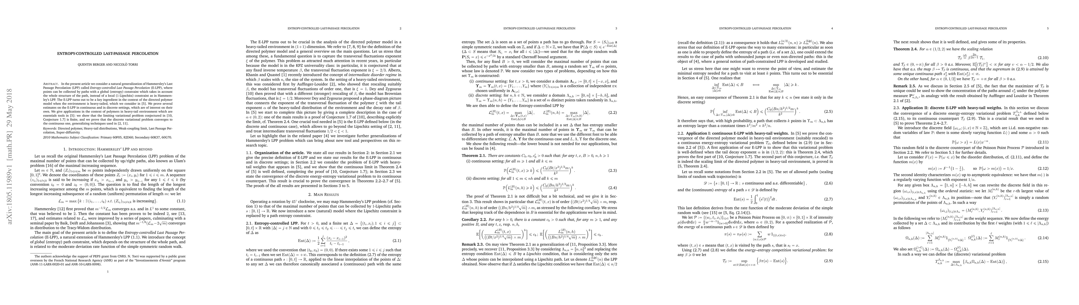 The paper presents a novel framework for Last Passage Percolation with entropy constraints, extending the classical LPP model and providing new estimates and convergence results.