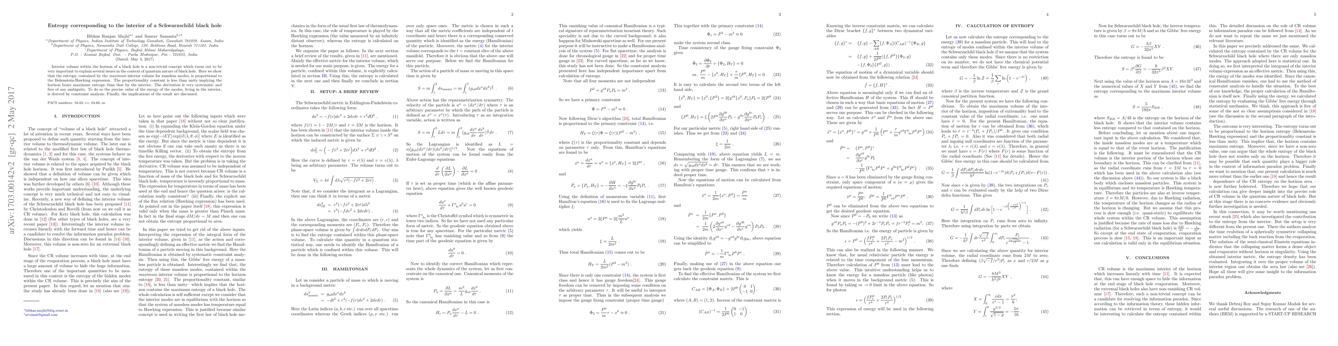 Interior volume within the horizon of a black hole is a non-trivial concept which turns out to be very important to explain several issues in the context of quantum nature of black hole. Here we show that the entropy, contained by the {\it maximum} interior volume for massless modes, is proportional to the Bekenstein-Hawking expression. The proportionality constant is less than unity implying the horizon bears maximum entropy than that by the interior. The derivation is very systematic and free of any ambiguity. To do so the precise value of the energy of the modes, living in the interior, is derived by constraint analysis. Finally, the implications of the result are discussed.