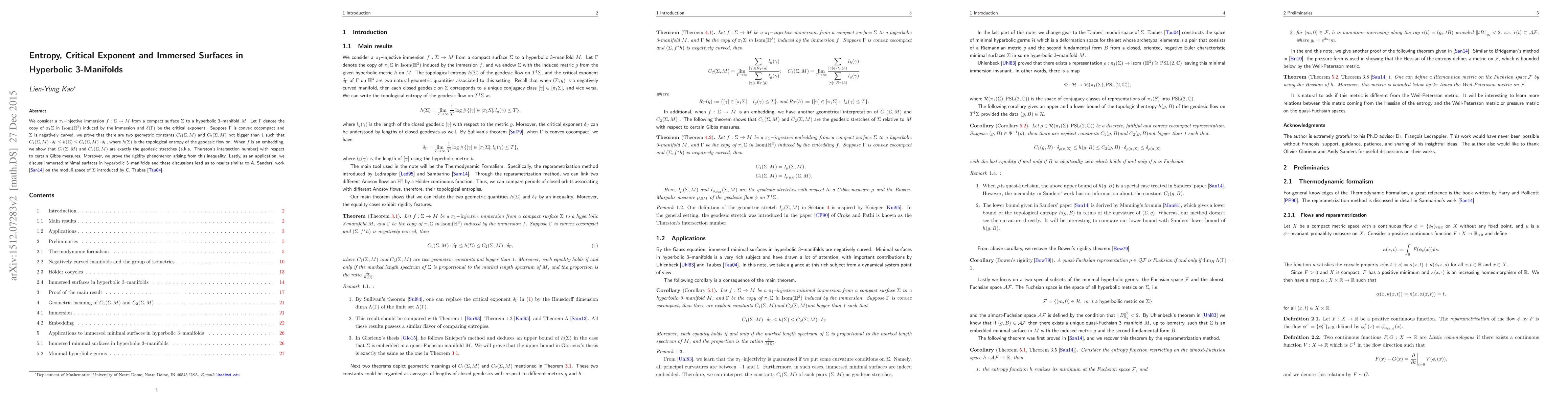 We consider a $\pi_{1}$--injective immersion $f:\Sigma\to M$ from a compact surface $\Sigma$ to a hyperbolic 3--manifold $M$. Let $\Gamma$ denote the copy of $\pi_{1}\Sigma$ in $\mathrm{Isom}({\mathbb{H}}^{3})$ induced by the immersion and $\delta(\Gamma)$ be the critical exponent. Suppose $\Gamma$ is convex cocompact and $\Sigma$ is negatively curved, we prove that there are two geometric constants $C_{1}(\Sigma,M)$ and $C_{2}(\Sigma,M)$ not bigger than $1$ such that $C_{1}(\Sigma,M)\cdot\delta_{\Gamma}\leq h(\Sigma)\leq C_{2}(\Sigma,M)\cdot\delta_{\Gamma}$, where $h(\Sigma)$ is the topological entropy of the geodesic flow on. When $f$ is an embedding, we show that $C_{1}(\Sigma,M)$ and $C_{2}(\Sigma,M)$ are exactly the geodesic stretches (a.k.a. Thurston's intersection number) with respect to certain Gibbs measures. Moreover, we prove the rigidity phenomenon arising from this inequality. Lastly, as an application, we discuss immersed minimal surfaces in hyperbolic 3--manifolds and these discussions lead us to results similar to A. Sanders' work on the moduli space of $\Sigma$ introduced by C. Taubes.