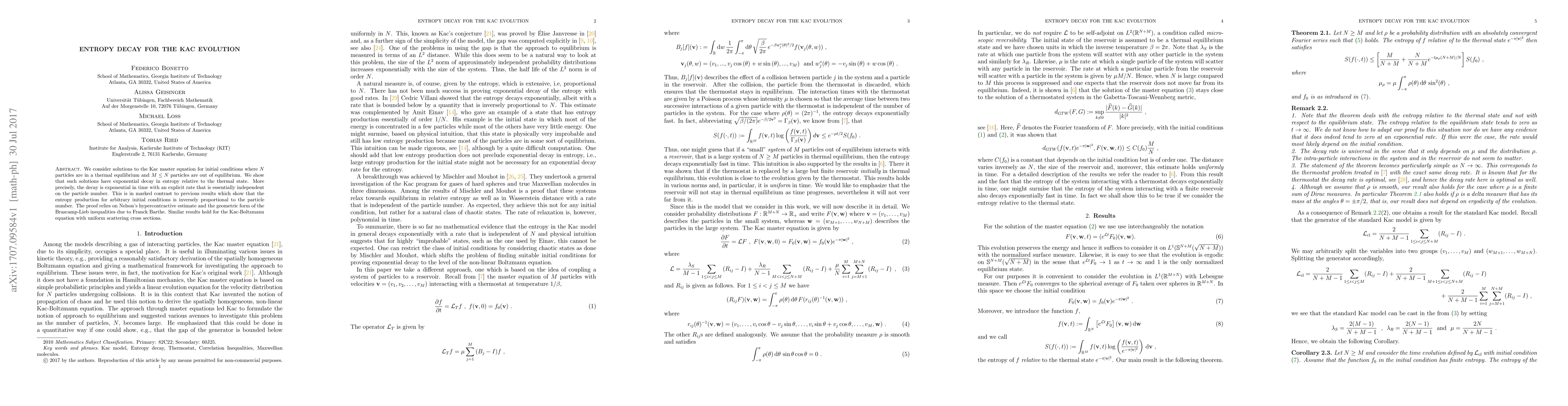 This paper demonstrates exponential decay in entropy for the Kac master equation when a subset of particles is initially out of equilibrium, contrasting with previous results that showed entropy production inversely proportional to particle number. The proof utilizes Nelson's hypercontractive estimate and Barthe's geometric form of the Brascamp-Lieb inequalities.