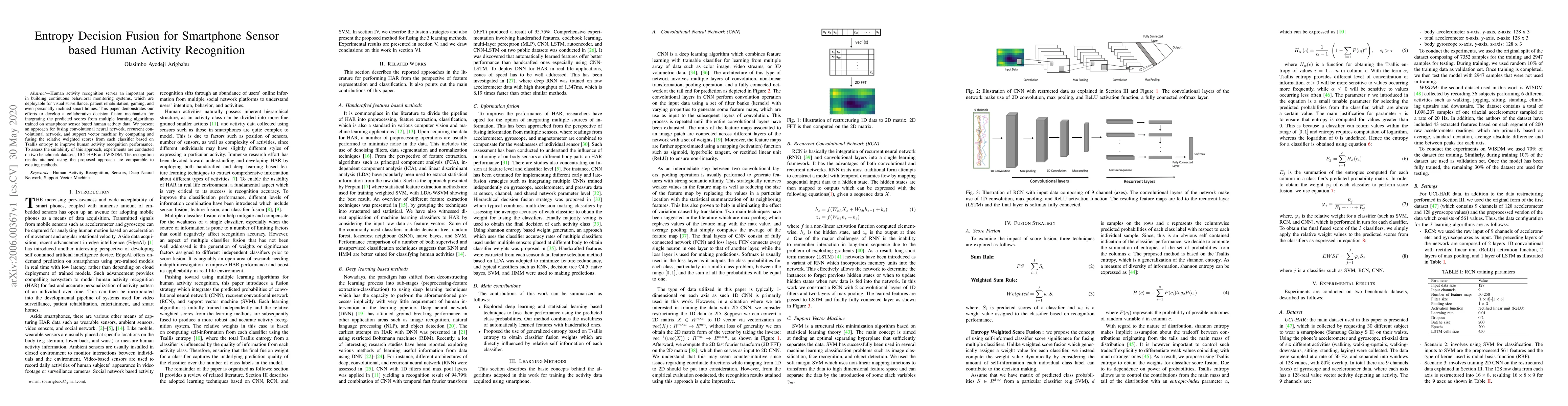This paper proposes an entropy-based decision fusion mechanism to enhance human activity recognition using smartphone sensors. It integrates predictions from multiple learning algorithms, including convolutional neural networks, recurrent convolutional networks, and support vector machines, to improve recognition accuracy. Experiments on UCI-HAR and WISDM datasets show comparable results to existing methods.