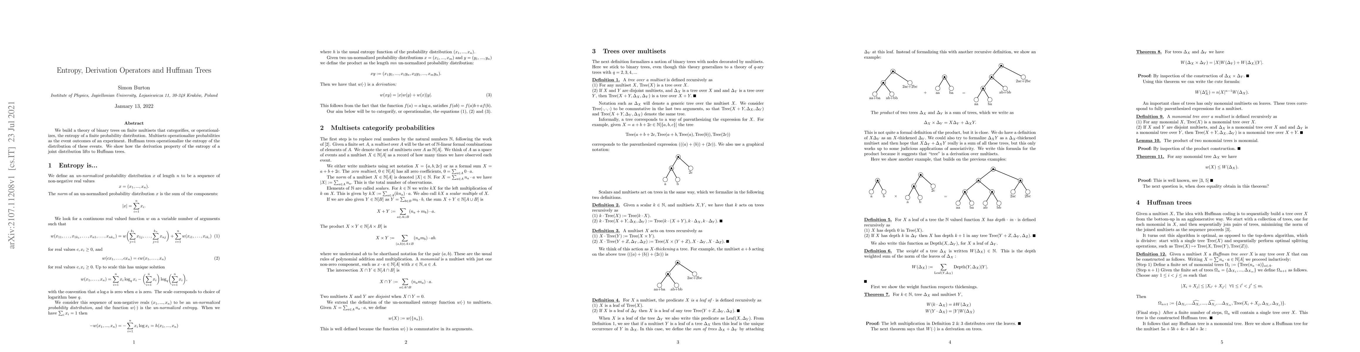 This paper develops a theory linking binary trees on finite multisets to entropy, where Huffman trees represent the operationalized entropy of probability distributions. It demonstrates how the derivation property of joint distribution entropy translates to Huffman trees.