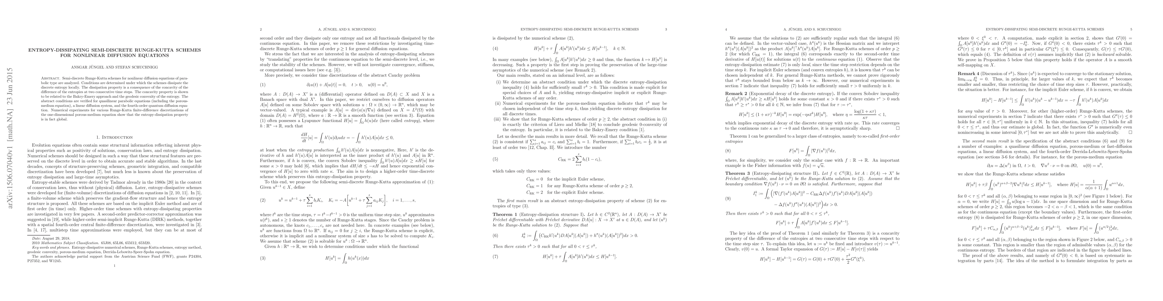 This paper analyzes semi-discrete Runge-Kutta schemes for nonlinear diffusion equations, determining conditions for local entropy dissipation linked to concavity and the Bakry-Emery approach. Numerical experiments confirm global entropy dissipation for various equations.