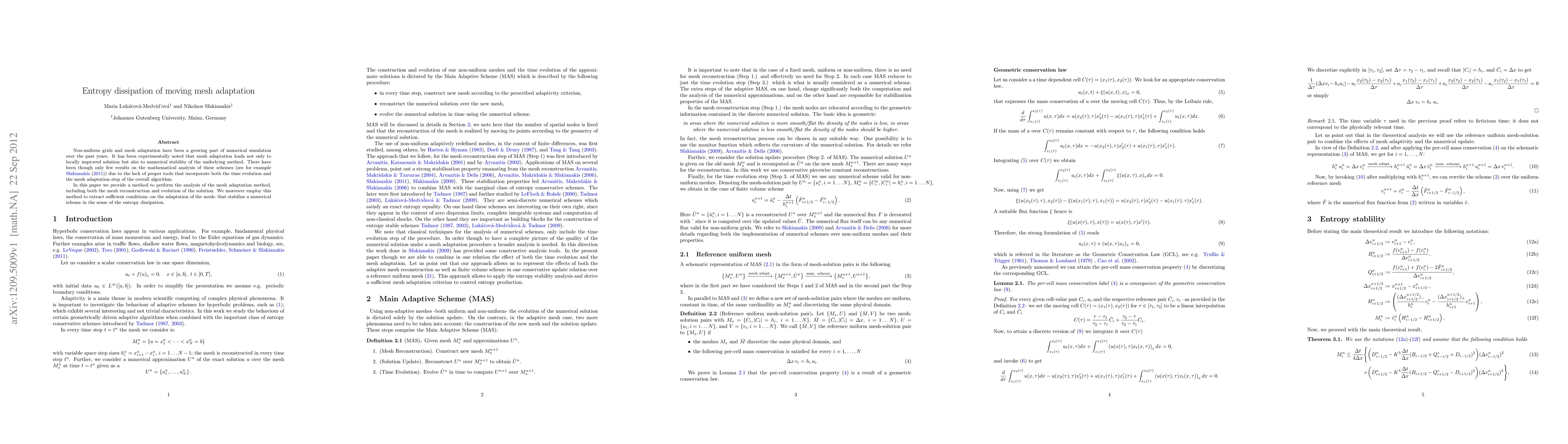 Non-uniform grids and mesh adaptation have been a growing part of numerical simulation over the past years. It has been experimentally noted that mesh adaptation leads not only to locally improved solution but also to numerical stability of the underlying method. There have been though only few results on the mathematical analysis of these schemes due to the lack of proper tools that incorporate both the time evolution and the mesh adaptation step of the overall algorithm. In this paper we provide a method to perform the analysis of the mesh adaptation method, including both the mesh reconstruction and evolution of the solution. We moreover employ this method to extract sufficient conditions -on the adaptation of the mesh- that stabilize a numerical scheme in the sense of the entropy dissipation.