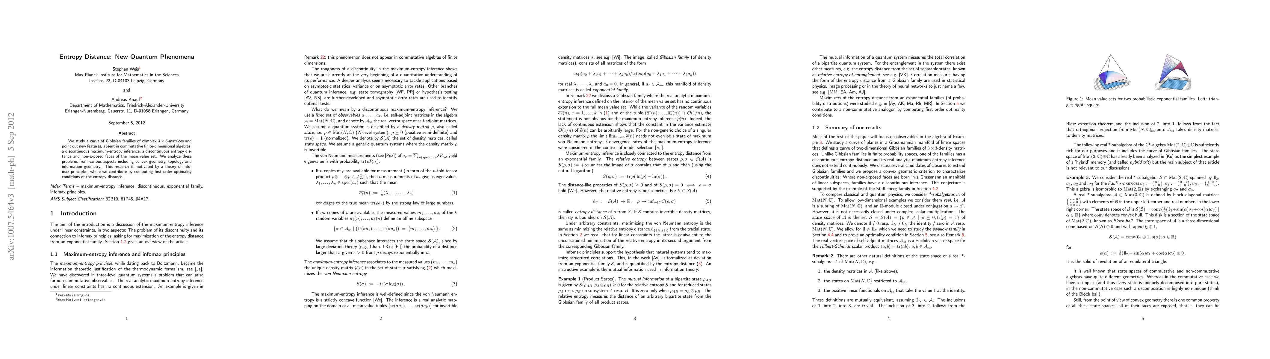 We study a curve of Gibbsian families of complex 3x3-matrices and point out new features, absent in commutative finite-dimensional algebras: a discontinuous maximum-entropy inference, a discontinuous entropy distance and non-exposed faces of the mean value set. We analyze these problems from various aspects including convex geometry, topology and information geometry. This research is motivated by a theory of info-max principles, where we contribute by computing first order optimality conditions of the entropy distance.