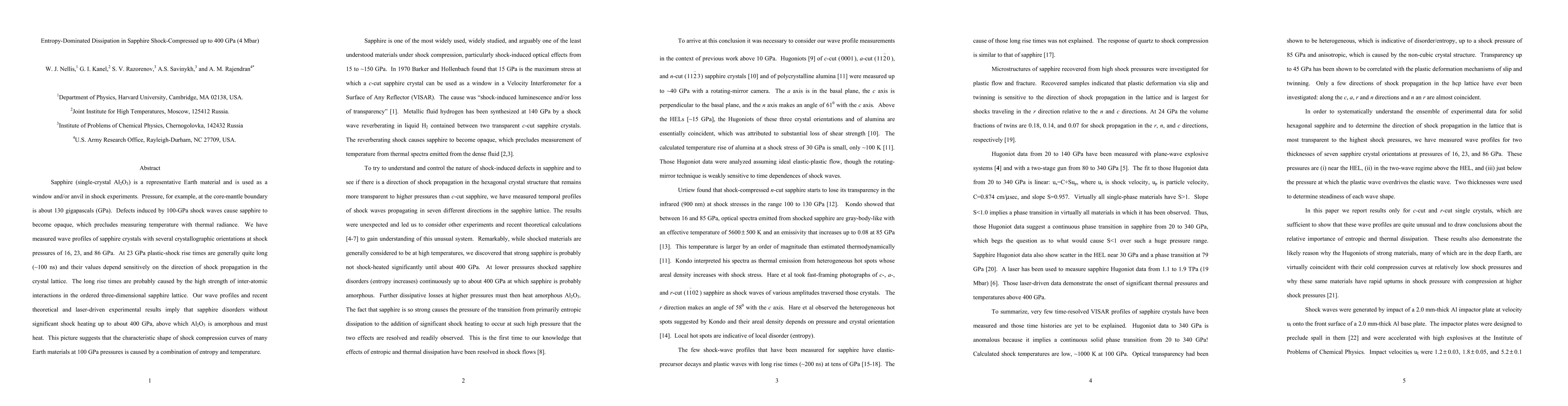 Sapphire (single-crystal Al2O3) is a representative Earth material and is used as a window and/or anvil in shock experiments. Pressure, for example, at the core-mantle boundary is about 130 gigapascals (GPa). Defects induced by 100-GPa shock waves cause sapphire to become opaque, which precludes measuring temperature with thermal radiance. We have measured wave profiles of sapphire crystals with several crystallographic orientations at shock pressures of 16, 23, and 86 GPa. At 23 GPa plastic-shock rise times are generally quite long (~100 ns) and their values depend sensitively on the direction of shock propagation in the crystal lattice. The long rise times are probably caused by the high strength of inter-atomic interactions in the ordered three-dimensional sapphire lattice. Our wave profiles and recent theoretical and laser-driven experimental results imply that sapphire disorders without significant shock heating up to about 400 GPa, above which Al2O3 is amorphous and must heat. This picture suggests that the characteristic shape of shock compression curves of many Earth materials at 100 GPa pressures is caused by a combination of entropy and temperature.