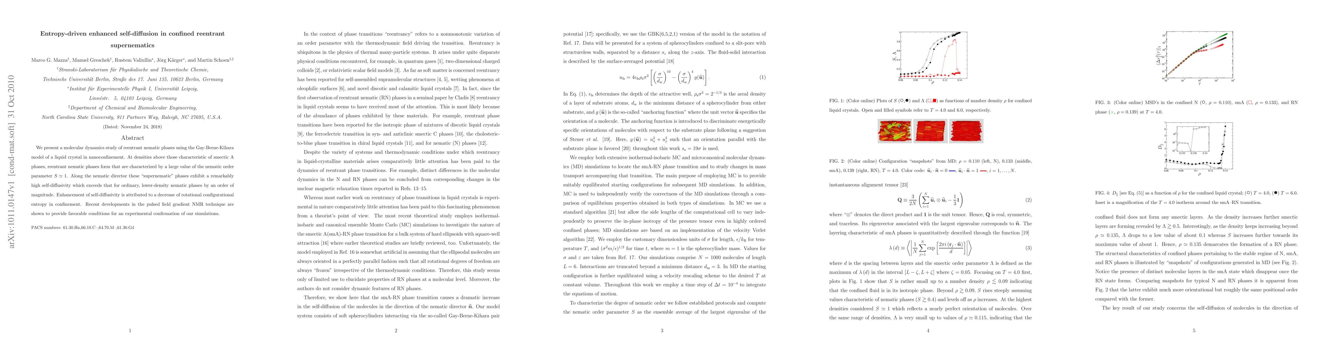 We present a molecular dynamics study of reentrant nematic phases using the Gay-Berne-Kihara model of a liquid crystal in nanoconfinement. At densities above those characteristic of smectic A phases, reentrant nematic phases form that are characterized by a large value of the nematic order parameter $S\simeq1$. Along the nematic director these "supernematic" phases exhibit a remarkably high self-diffusivity which exceeds that for ordinary, lower-density nematic phases by an order of magnitude. Enhancement of self-diffusivity is attributed to a decrease of rotational configurational entropy in confinement. Recent developments in the pulsed field gradient NMR technique are shown to provide favorable conditions for an experimental confirmation of our simulations.