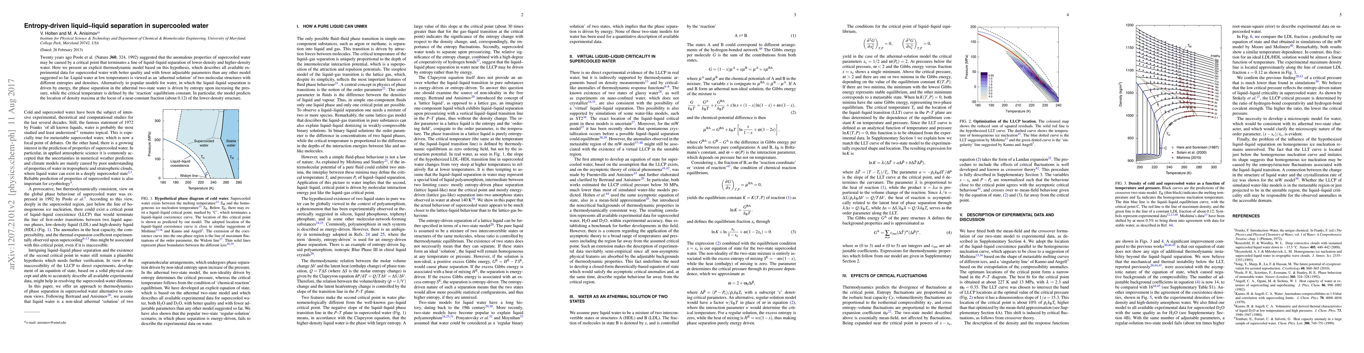 This work differs from previous models by proposing entropy-driven liquid-liquid separation in supercooled water, contrasting with energy-driven models, and provides a more parsimonious description of experimental data.