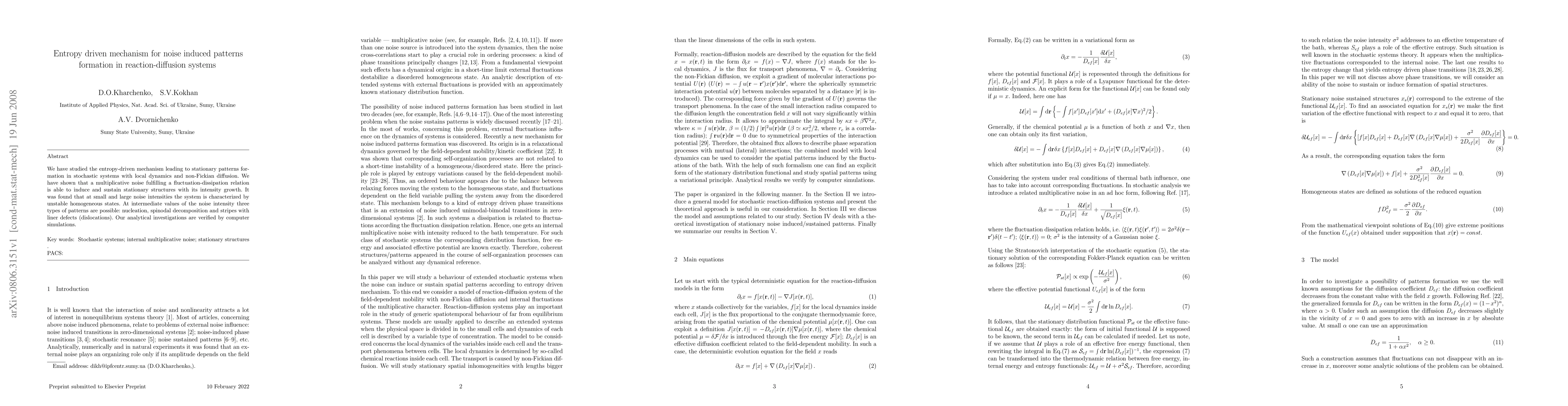 This paper investigates an entropy-driven mechanism for pattern formation in reaction-diffusion systems under stochastic influences, revealing that multiplicative noise induces and sustains stable structures. Analytical findings show three pattern types—nucleation, spinodal decomposition, and striped structures with dislocations—verified by computer simulations.