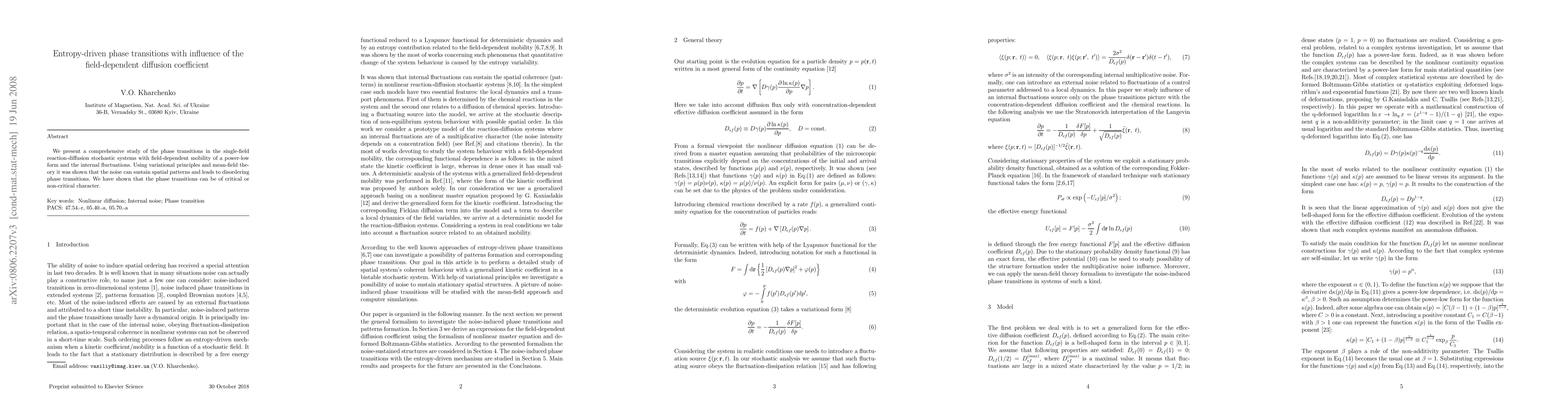 We present a comprehensive study of the phase transitions in the single-field reaction-diffusion stochastic systems with field-dependent mobility of a power-low form and the internal fluctuations. Using variational principles and mean-field theory it was shown that the noise can sustain spatial patterns and leads to disordering phase transitions. We have shown that the phase transitions can be of critical or non-critical character.