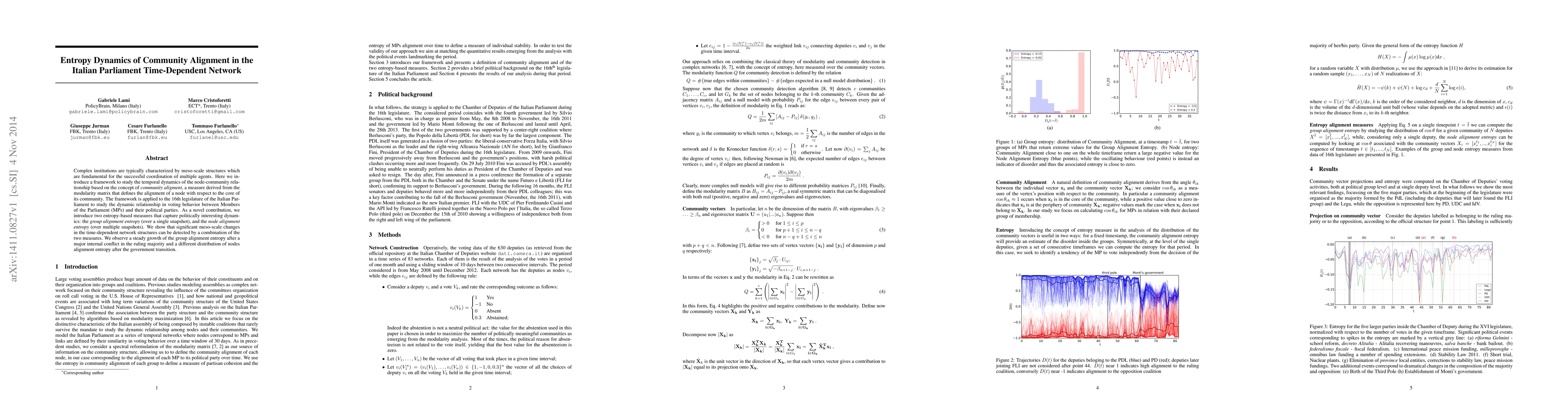 This paper introduces a framework to analyze the temporal dynamics of community alignment in the Italian Parliament, using entropy-based measures to capture changes in voting behavior. The study reveals significant shifts in political alignments following internal conflicts and government transitions.