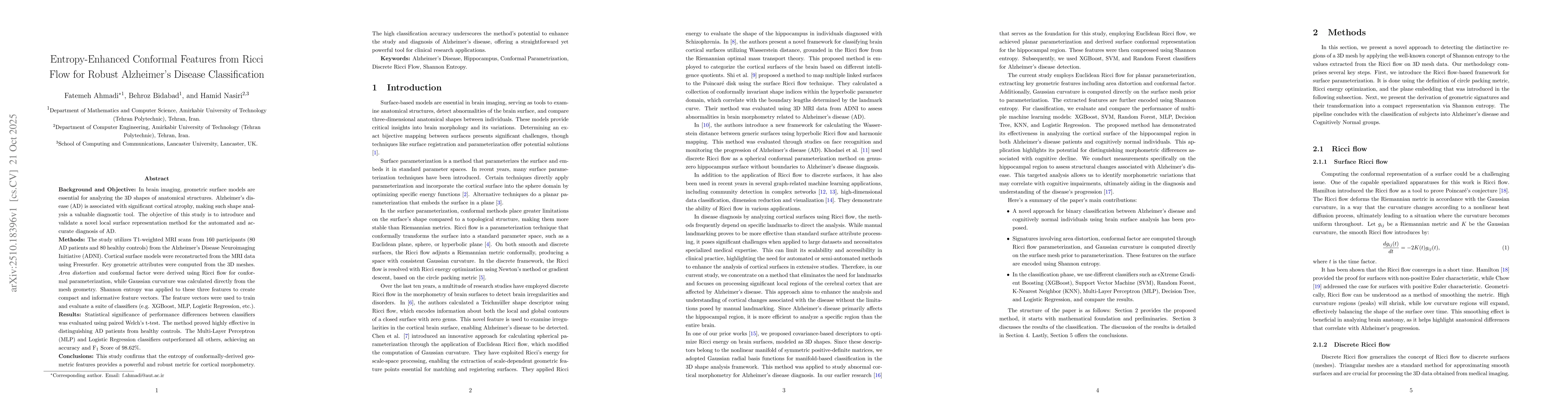 Background and Objective: In brain imaging, geometric surface models are essential for analyzing the 3D shapes of anatomical structures. Alzheimer's disease (AD) is associated with significant cortical atrophy, making such shape analysis a valuable diagnostic tool. The objective of this study is to introduce and validate a novel local surface representation method for the automated and accurate diagnosis of AD. Methods: The study utilizes T1-weighted MRI scans from 160 participants (80 AD patients and 80 healthy controls) from the Alzheimer's Disease Neuroimaging Initiative (ADNI). Cortical surface models were reconstructed from the MRI data using Freesurfer. Key geometric attributes were computed from the 3D meshes. Area distortion and conformal factor were derived using Ricci flow for conformal parameterization, while Gaussian curvature was calculated directly from the mesh geometry. Shannon entropy was applied to these three features to create compact and informative feature vectors. The feature vectors were used to train and evaluate a suite of classifiers (e.g. XGBoost, MLP, Logistic Regression, etc.). Results: Statistical significance of performance differences between classifiers was evaluated using paired Welch's t-test. The method proved highly effective in distinguishing AD patients from healthy controls. The Multi-Layer Perceptron (MLP) and Logistic Regression classifiers outperformed all others, achieving an accuracy and F$_1$ Score of 98.62%. Conclusions: This study confirms that the entropy of conformally-derived geometric features provides a powerful and robust metric for cortical morphometry. The high classification accuracy underscores the method's potential to enhance the study and diagnosis of Alzheimer's disease, offering a straightforward yet powerful tool for clinical research applications.