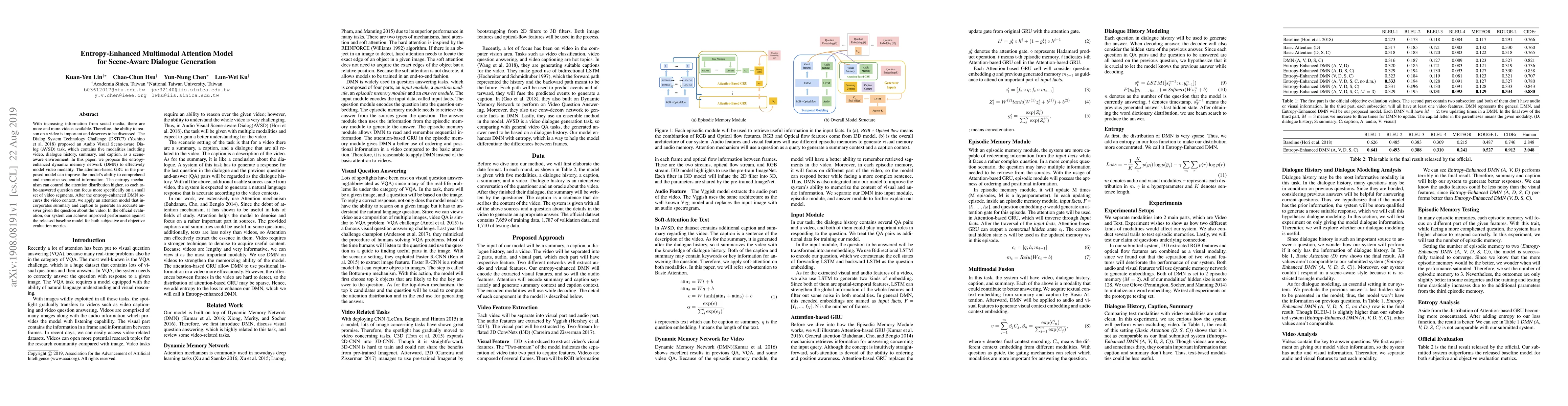 The paper proposes an entropy-enhanced dynamic memory network to model video modality for the Audio Visual Scene-aware Dialog task, improving the model's attention to specific video segments and generating accurate answers. The system outperforms baseline models in both subjective and objective evaluations.