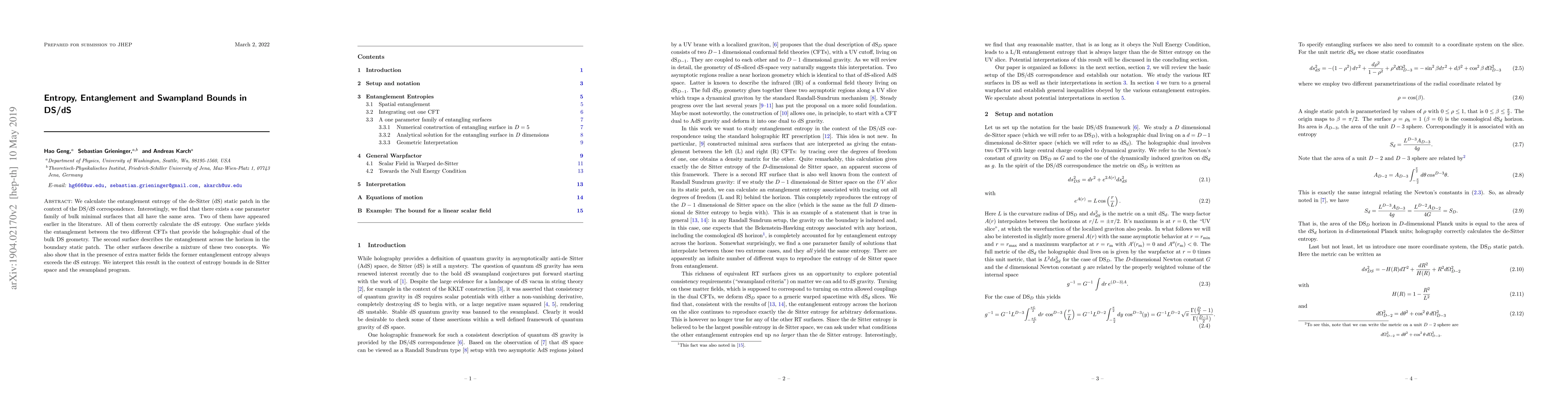 We calculate the entanglement entropy of the de-Sitter (dS) static patch in the context of the DS/dS correspondence. Interestingly, we find that there exists a one parameter family of bulk minimal surfaces that all have the same area. Two of them have appeared earlier in the literature. All of them correctly calculate the dS entropy. One surface yields the entanglement between the two different CFTs that provide the holographic dual of the bulk DS geometry. The second surface describes the entanglement across the horizon in the boundary static patch. The other surfaces describe a mixture of these two concepts. We also show that in the presence of extra matter fields the former entanglement entropy always exceeds the dS entropy. We interpret this result in the context of entropy bounds in de Sitter space and the swampland program.