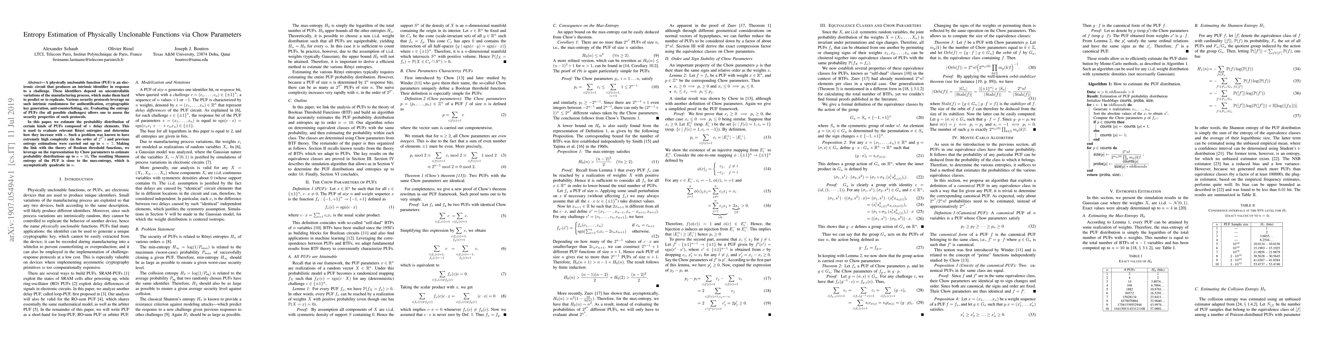 This paper estimates the entropy of PUFs composed of delay elements using Chow parameters, enabling the evaluation of Rényi entropies up to $n=10$. The method reveals that the Shannon entropy approaches the maximum possible, growing asymptotically quadratic with $n$.