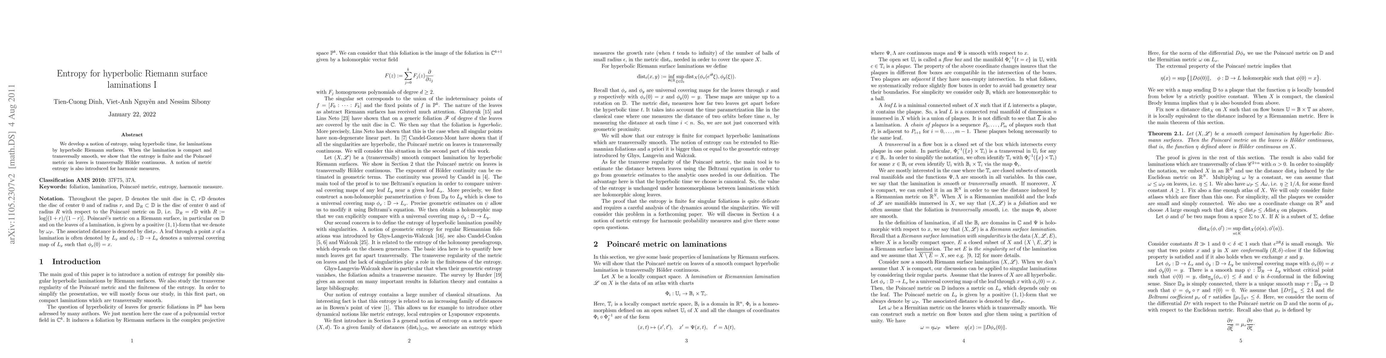 This paper introduces a hyperbolic time-based entropy for laminations by hyperbolic Riemann surfaces and proves it is finite when the lamination is compact and transversally smooth. It also demonstrates that the Poincaré metric on the leaves is transversally Hölder continuous and presents a metric entropy for harmonic measures.