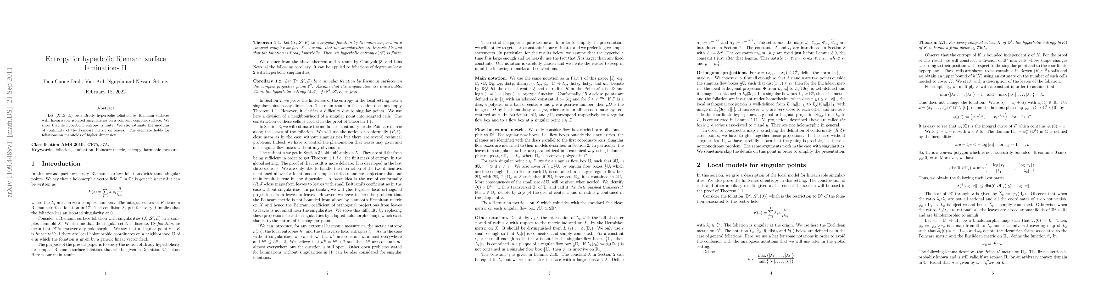 Consider a Brody hyperbolic foliation by Riemann surfaces with linearizable isolated singularities on a compact complex surface. We show that its hyperbolic entropy is finite. We also estimate the modulus of continuity of the Poincare metric on leaves. The estimate holds for foliations on manifolds of higher dimension.