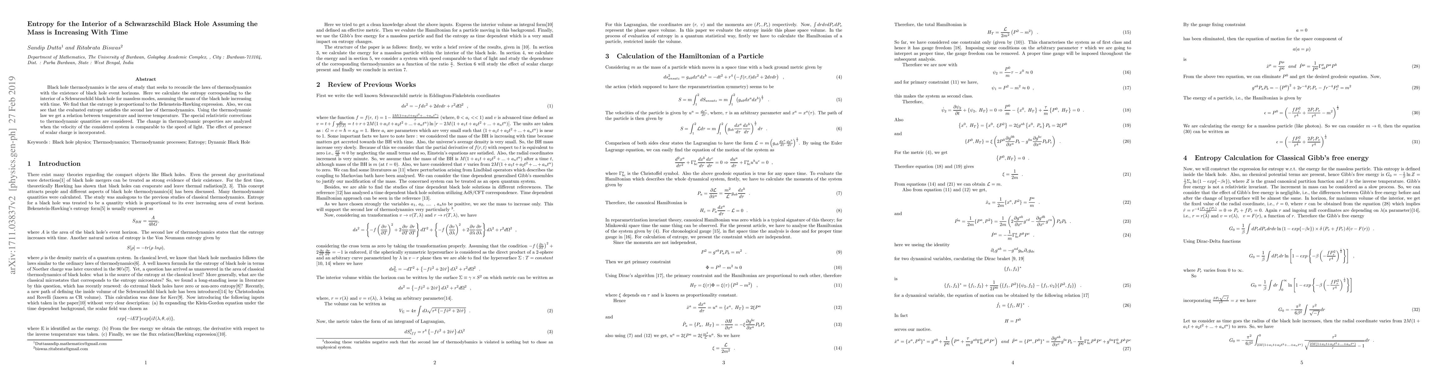 This paper calculates the entropy of the interior of a Schwarzschild black hole for massless modes, assuming the mass increases with time, finding it proportional to the Bekenstein-Hawking expression and satisfying the second law of thermodynamics. Special relativistic corrections and the effect of scalar charge are also considered.