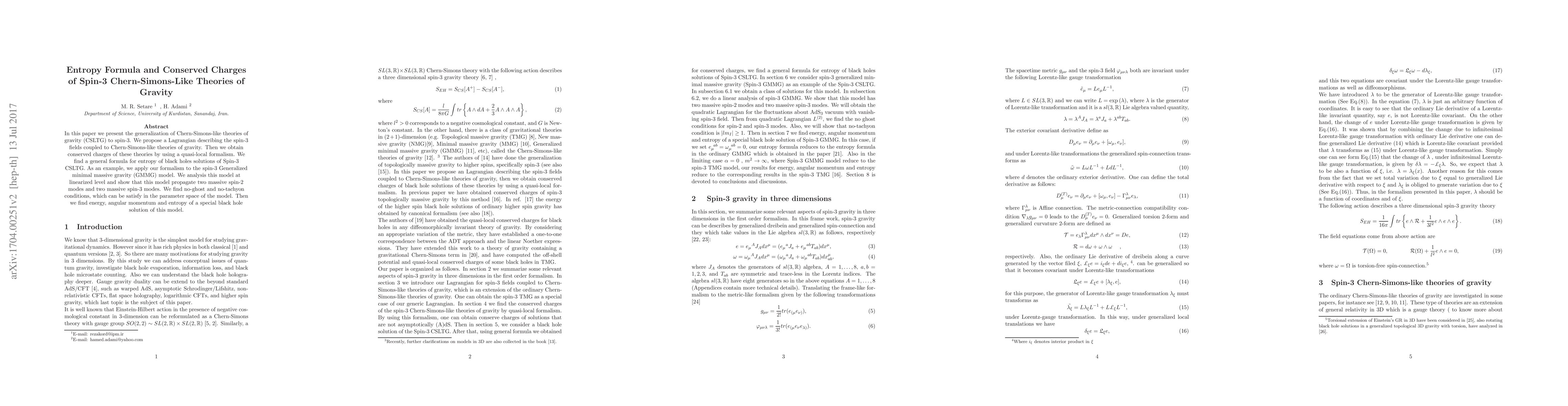 This paper generalizes Chern-Simons-like theories of gravity to spin-3, proposing a Lagrangian for spin-3 fields and deriving conserved charges using quasi-local formalism. It introduces a general entropy formula for black hole solutions in spin-3 CSLTG and applies it to the spin-3 Generalized minimal massive gravity model, confirming the absence of ghosts and tachyons and calculating energy, angular momentum, and entropy for a specific black hole solution.