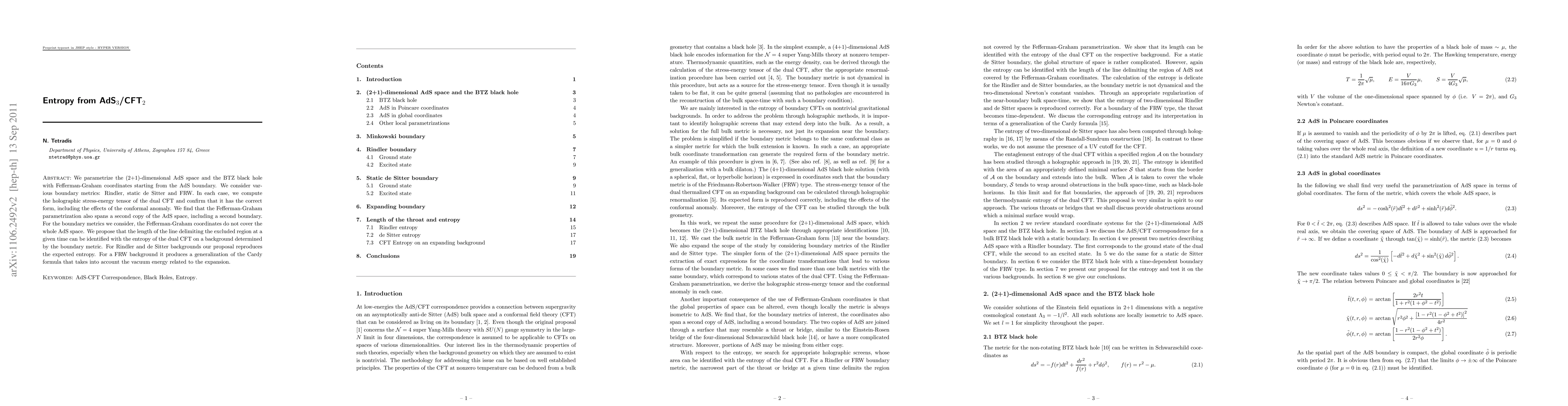 We parametrize the (2+1)-dimensional AdS space and the BTZ black hole with Fefferman-Graham coordinates starting from the AdS boundary. We consider various boundary metrics: Rindler, static de Sitter and FRW. In each case, we compute the holographic stress-energy tensor of the dual CFT and confirm that it has the correct form, including the effects of the conformal anomaly. We find that the Fefferman-Graham parametrization also spans a second copy of the AdS space, including a second boundary. For the boundary metrics we consider, the Fefferman-Graham coordinates do not cover the whole AdS space. We propose that the length of the line delimiting the excluded region at a given time can be identified with the entropy of the dual CFT on a background determined by the boundary metric. For Rindler and de Sitter backgrounds our proposal reproduces the expected entropy. For a FRW background it produces a generalization of the Cardy formula that takes into account the vacuum energy related to the expansion.
