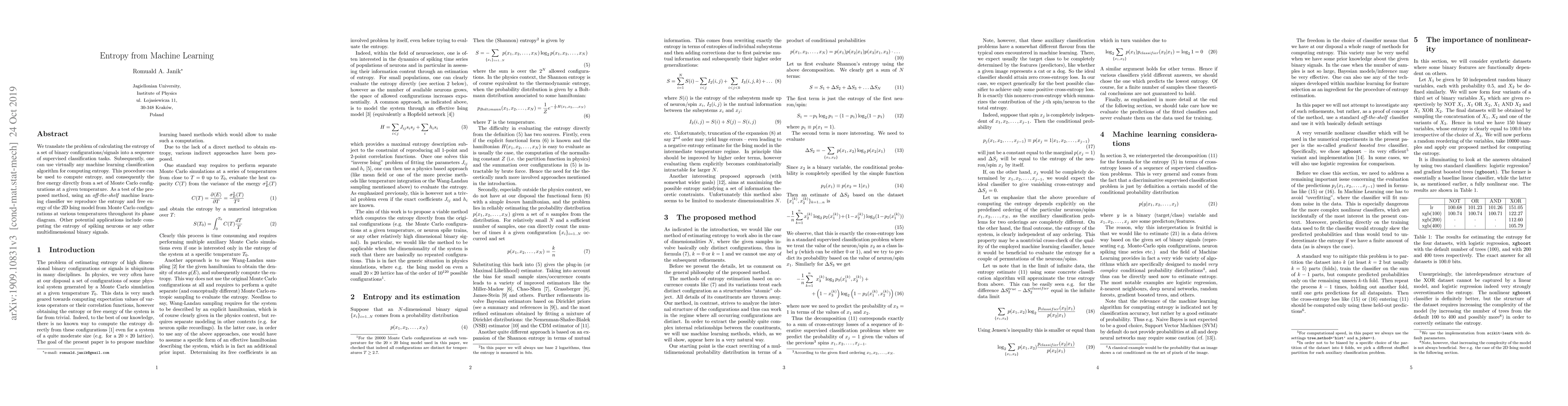 This paper proposes a method to calculate entropy using machine learning by framing it as a supervised classification task, demonstrating its application on the 2D Ising model and suggesting broader uses for multidimensional binary signals like spiking neurons.