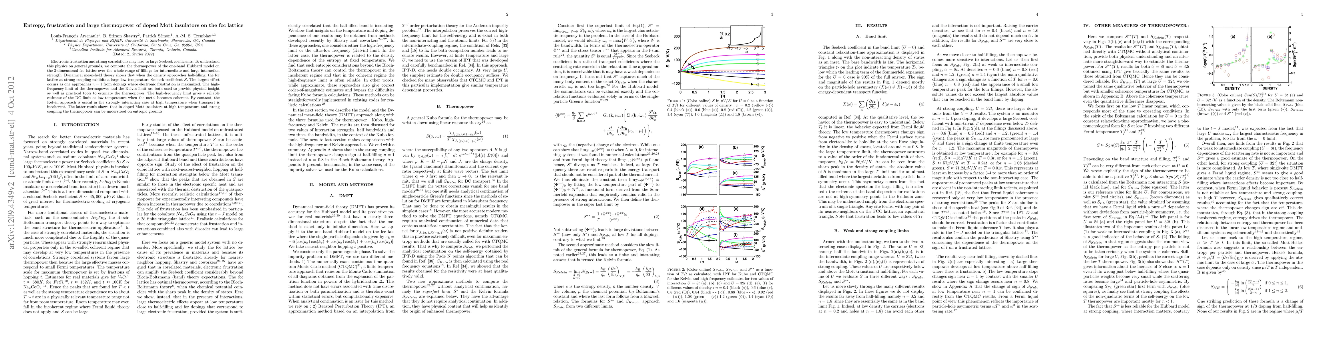 Electronic frustration and strong correlations may lead to large Seebeck coefficients. To understand this physics on general grounds, we compute the thermopower of the one-band Hubbard model on the 3-dimensional fcc lattice over the whole range of fillings for intermediate and large interaction strength. Dynamical mean-field theory shows that when the density approaches half-filling, the fcc lattice at strong coupling exhibits a large low temperature Seebeck coefficient $S$. The largest effect occurs as one approaches $n=1$ from dopings where electronic frustration is maximized. The high-frequency limit of the thermopower and the Kelvin limit are both used to provide physical insight as well as practical tools to estimate the thermopower. The high-frequency limit gives a reliable estimate of the DC limit at low temperature when the metal becomes coherent. By contrast, the Kelvin approach is useful in the strongly interacting case at high temperature when transport is incoherent. The latter result shows that in doped Mott insulators at high temperature and strong coupling the thermopower can be understood on entropic grounds.
