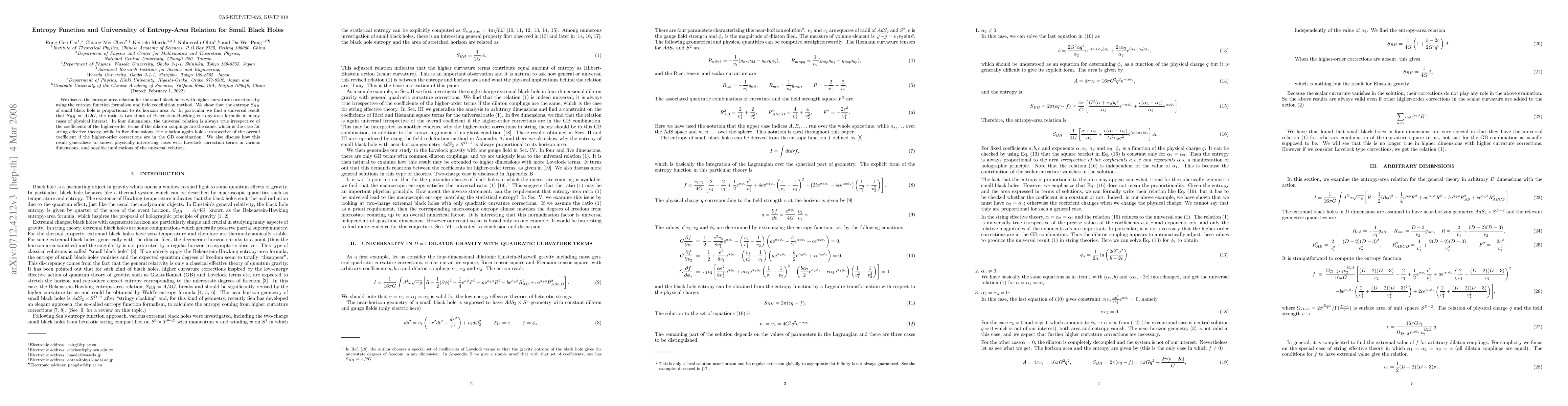 This paper explores the entropy-area relation for small black holes, demonstrating that their entropy is proportional to their horizon area with a universal ratio of $S_{BH}=A/2G$. It shows that this relation holds universally in four dimensions for string theory and in five dimensions for Gauss-Bonnet corrections, regardless of higher-order term coefficients.