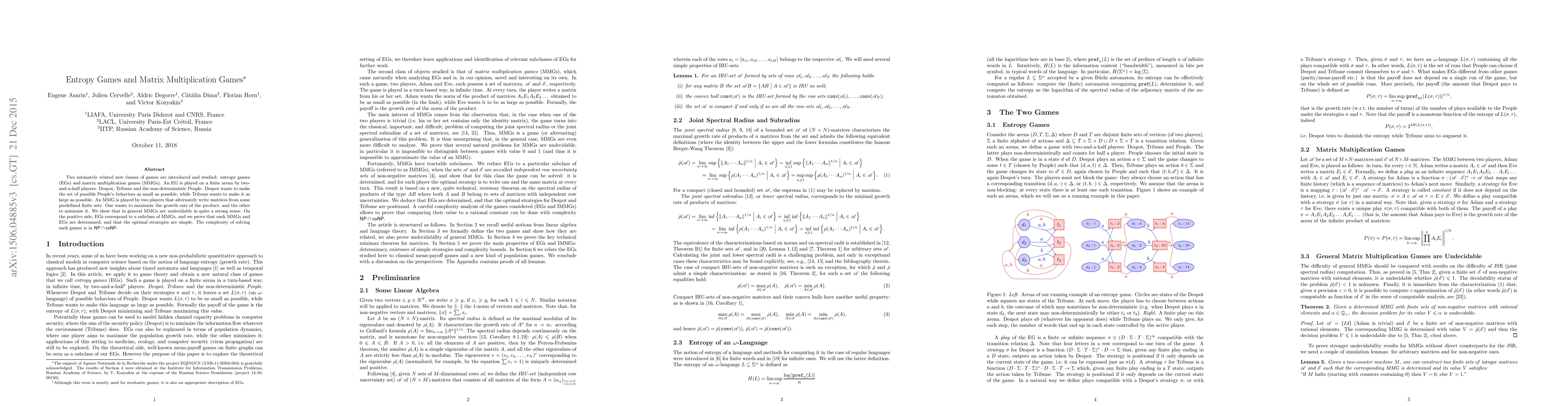 Two intimately related new classes of games are introduced and studied: entropy games (EGs) and matrix multiplication games (MMGs). An EG is played on a finite arena by two-and-a-half players: Despot, Tribune and the non-deterministic People. Despot wants to make the set of possible People's behaviors as small as possible, while Tribune wants to make it as large as possible.An MMG is played by two players that alternately write matrices from some predefined finite sets. One wants to maximize the growth rate of the product, and the other to minimize it. We show that in general MMGs are undecidable in quite a strong sense.On the positive side, EGs correspond to a subclass of MMGs, and we prove that such MMGs and EGs are determined, and that the optimal strategies are simple. The complexity of solving such games is in NP\&coNP.