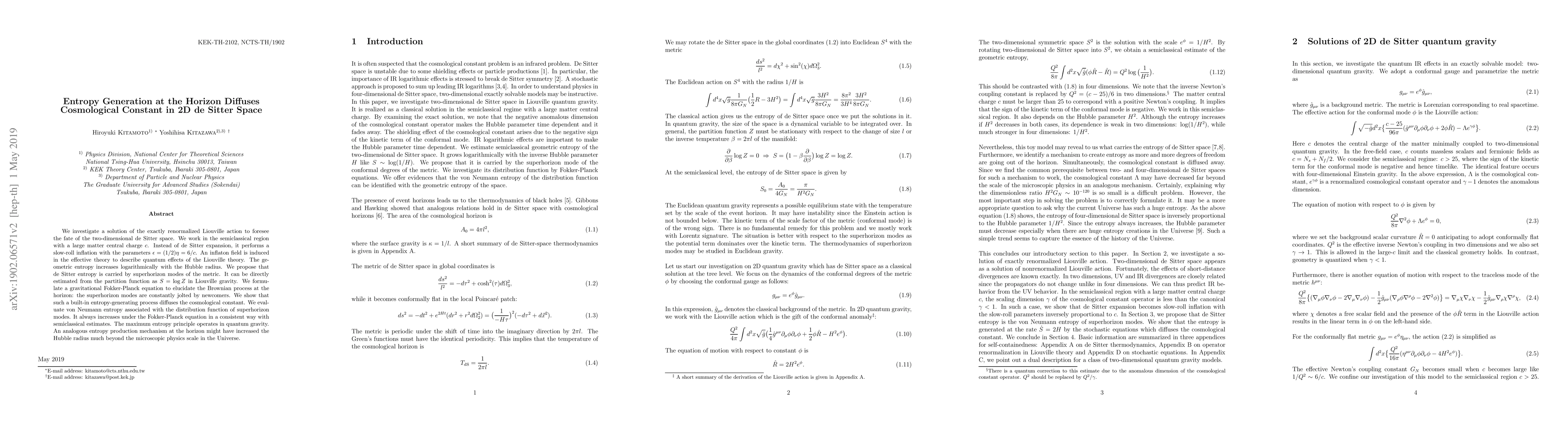 We investigate a solution of the exactly renormalized Liouville action to foresee the fate of the two-dimensional de Sitter space. We work in the semiclassical region with a large matter central charge $c$. Instead of de Sitter expansion, it performs a slow-roll inflation with the parameters $\epsilon=(1/2)\eta =6/c$. An inflaton field is induced in the effective theory to describe quantum effects of the Liouville theory. The geometric entropy increases logarithmically with the Hubble radius. We propose that de Sitter entropy is carried by superhorizon modes of the metric. It can be directly estimated from the partition function as $S=\log Z$ in Liouville gravity. We formulate a gravitational Fokker-Planck equation to elucidate the Brownian process at the horizon: the superhorizon modes are constantly jolted by newcomers. We show that such a built-in entropy-generating process diffuses the cosmological constant. We evaluate von Neumann entropy associated with the distribution function of superhorizon modes. It always increases under the Fokker-Planck equation in a consistent way with semiclassical estimates. The maximum entropy principle operates in quantum gravity. An analogous entropy production mechanism at the horizon might have increased the Hubble radius much beyond the microscopic physics scale in the Universe.
