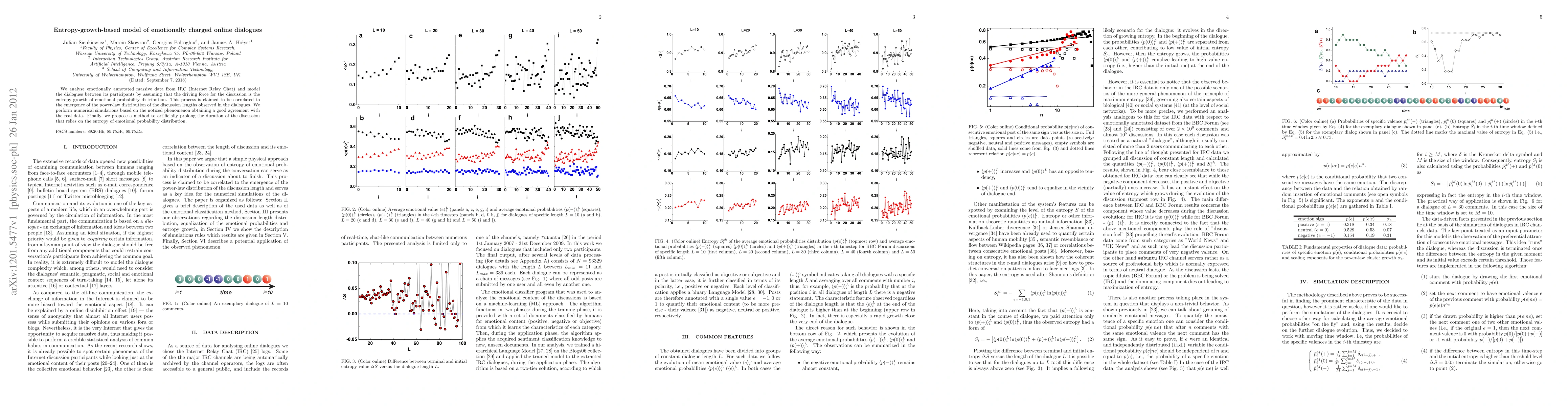 We analyze emotionally annotated massive data from IRC (Internet Relay Chat) and model the dialogues between its participants by assuming that the driving force for the discussion is the entropy growth of emotional probability distribution. This process is claimed to be correlated to the emergence of the power-law distribution of the discussion lengths observed in the dialogues. We perform numerical simulations based on the noticed phenomenon obtaining a good agreement with the real data. Finally, we propose a method to artificially prolong the duration of the discussion that relies on the entropy of emotional probability distribution.