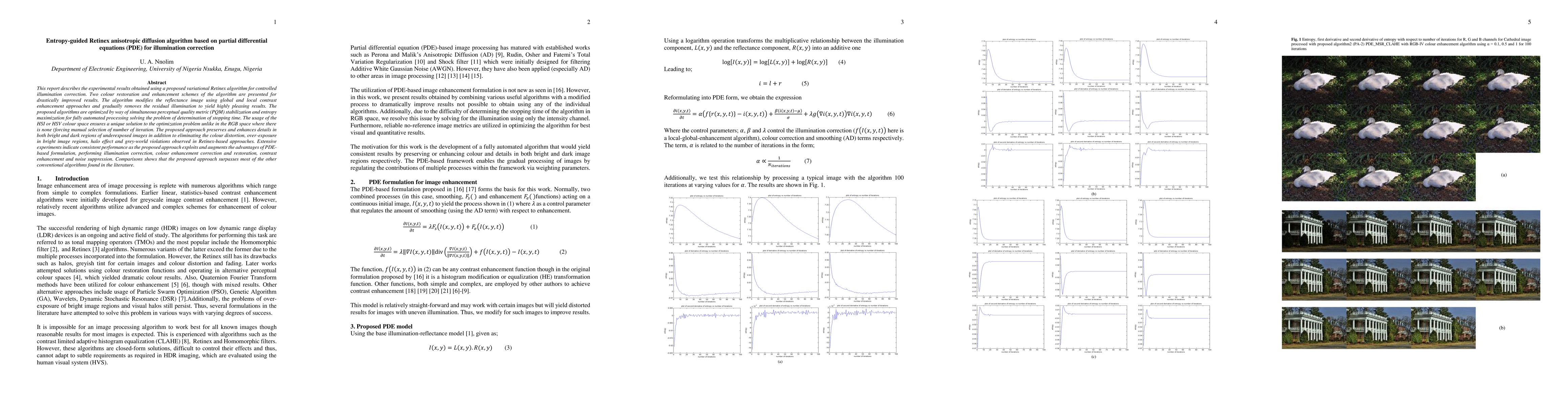 This paper proposes an entropy-guided Retinex algorithm using anisotropic diffusion based on PDE for illumination correction, achieving enhanced colour restoration and contrast. The method optimizes stopping time through simultaneous perceptual quality metric stabilization and entropy maximization, outperforming conventional algorithms.