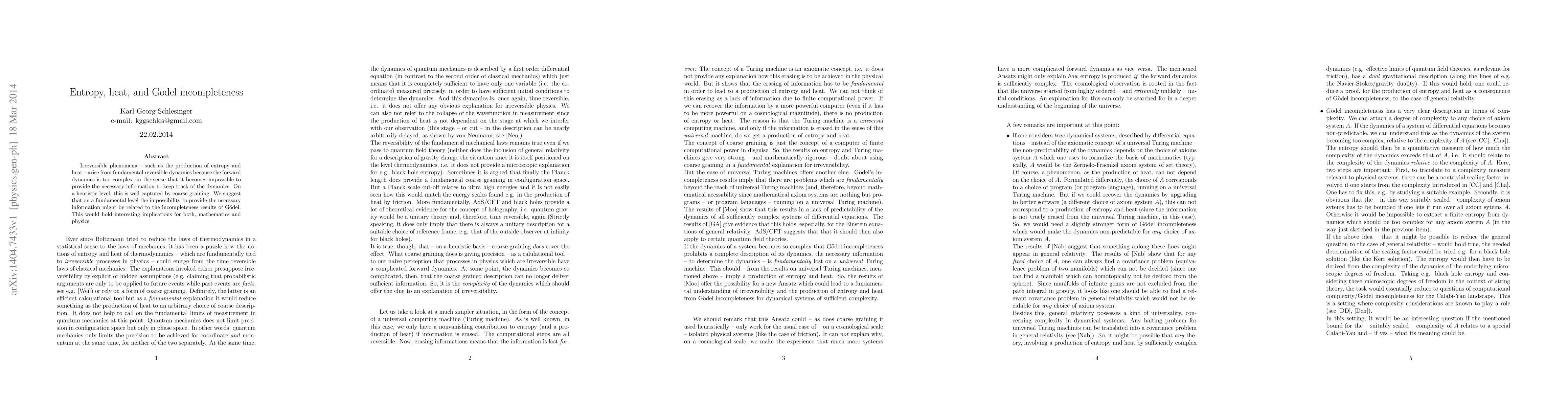 Irreversible phenomena, such as the production of entropy and heat, arise from fundamental reversible dynamics because the forward dynamics is too complex, in the sense that it becomes impossible to provide the necessary information to keep track of the dynamics. On a heuristic level, this is well captured by coarse graining. We suggest that on a fundamental level the impossibility to provide the necessary information might be related to the incompleteness results of G\"odel. This would hold interesting implications for both, mathematics and physics.