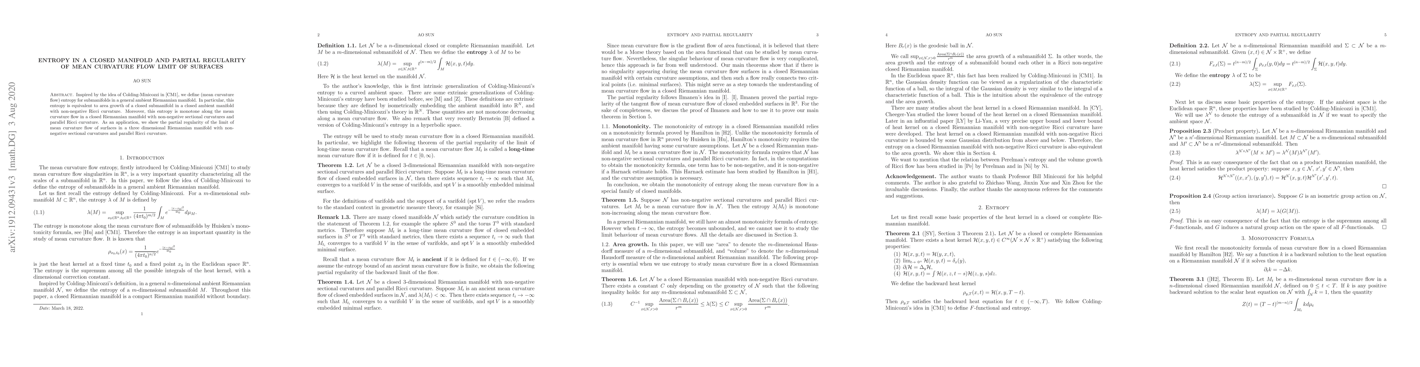 Inspired by the idea of Colding-Minicozzi in [CM1], we define (mean curvature flow) entropy for submanifolds in a general ambient Riemannian manifold. In particular, this entropy is equivalent to area growth of a closed submanifold in a closed ambient manifold with non-negative Ricci curvature. Moreover, this entropy is monotone along the mean curvature flow in a closed Riemannian manifold with non-negative sectional curvatures and parallel Ricci curvature. As an application, we show the partial regularity of the limit of mean curvature flow of surfaces in a three dimensional Riemannian manifold with non-negative sectional curvatures and parallel Ricci curvature.