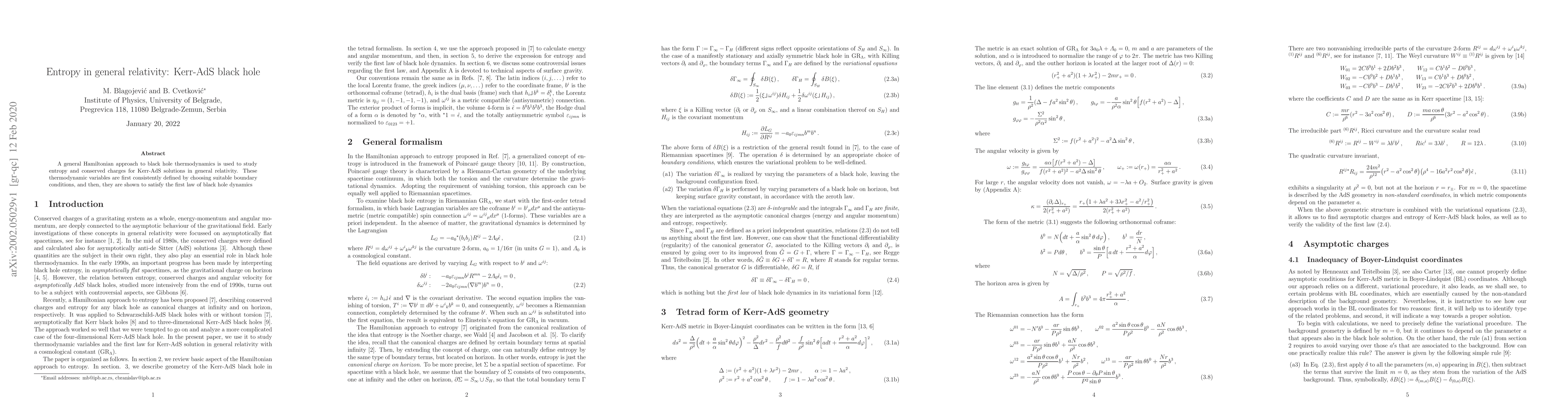 A general Hamiltonian approach to black hole thermodynamics is used to study entropy and conserved charges for Kerr-AdS solutions in general relativity. These thermodynamic variables are first consistently defined by choosing suitable boundary conditions, and then, they are shown to satisfy the first law of black hole dynamics