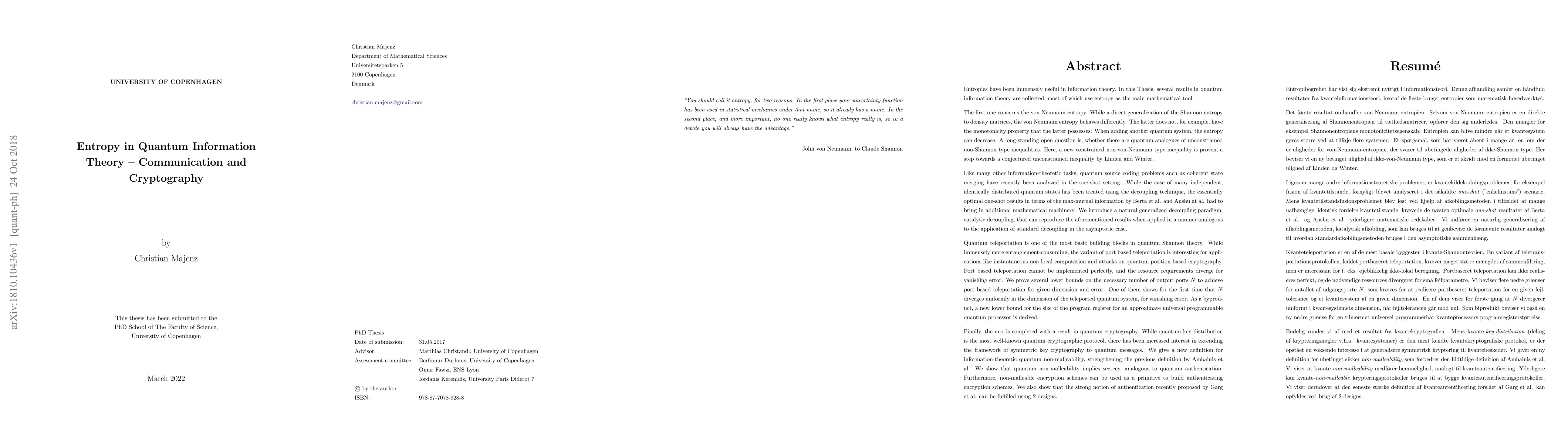 In this Thesis, several results in quantum information theory are collected, most of which use entropy as the main mathematical tool. *While a direct generalization of the Shannon entropy to density matrices, the von Neumann entropy behaves differently. A long-standing open question is, whether there are quantum analogues of unconstrained non-Shannon type inequalities. Here, a new constrained non-von-Neumann type inequality is proven, a step towards a conjectured unconstrained inequality by Linden and Winter. *IID quantum state merging can be optimally achieved using the decoupling technique. The one-shot results by Berta et al. and Anshu at al., however, had to bring in additional mathematical machinery. We introduce a natural generalized decoupling paradigm, catalytic decoupling, that can reproduce the aforementioned results when used analogously to the application of standard decoupling in the asymptotic case. *Port based teleportation, a variant of standard quantum teleportation protocol, cannot be implemented perfectly. We prove several lower bounds on the necessary number of output ports N to achieve port based teleportation for given error and input dimension, showing that N diverges uniformly in the dimension of the teleported quantum system, for vanishing error. As a byproduct, a new lower bound for the size of the program register for an approximate universal programmable quantum processor is derived. *In the last part, we give a new definition for information-theoretic quantum non-malleability, strengthening the previous definition by Ambainis et al. We show that quantum non-malleability implies secrecy, analogous to quantum authentication. Furthermore, non-malleable encryption schemes can be used as a primitive to build authenticating encryption schemes. We also show that the strong notion of authentication recently proposed by Garg et al. can be fulfilled using 2-designs.