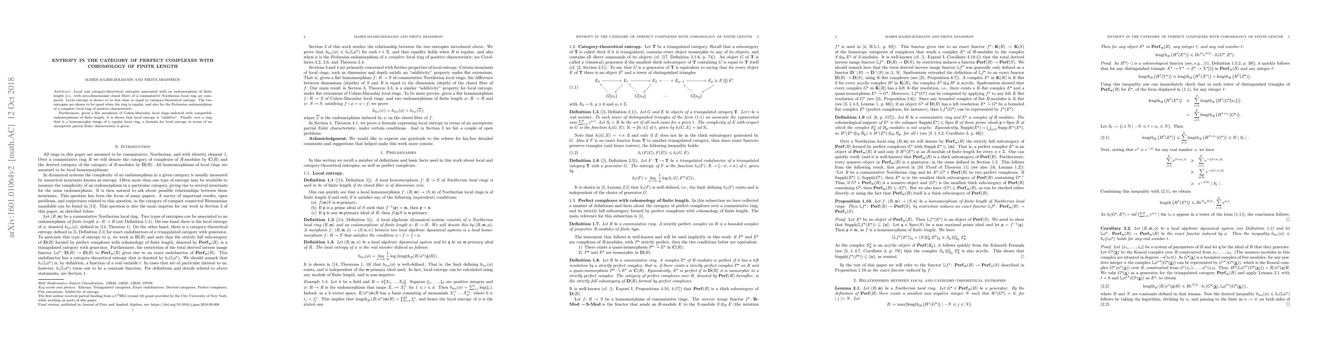 Local and category-theoretical entropies associated with an endomorphism of finite length (i.e., with zero-dimensional closed fiber) of a commutative Noetherian local ring are compared. Local entropy is shown to be less than or equal to category-theoretical entropy. The two entropies are shown to be equal when the ring is regular, and also for the Frobenius endomorphism of a complete local ring of positive characteristic. Furthermore, given a flat morphism of Cohen-Macaulay local rings endowed with compatible endomorphisms of finite length, it is shown that local entropy is "additive". Finally, over a ring that is a homomorphic image of a regular local ring, a formula for local entropy in terms of an asymptotic partial Euler characteristic is given.