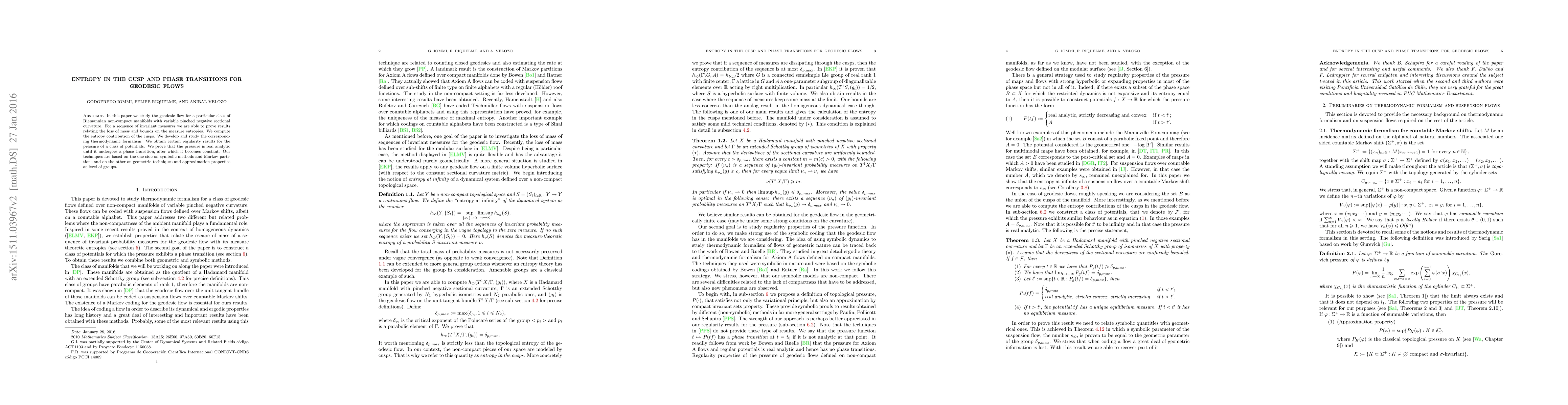In this paper we study the geodesic flow for a particular class of Riemannian non-compact manifolds with variable pinched negative sectional curvature. For a sequence of invariant measures we are able to prove results relating the loss of mass and bounds on the measure entropies. We compute the entropy contribution of the cusps. We develop and study the corresponding thermodynamic formalism. We obtain certain regularity results for the pressure of a class of potentials. We prove that the pressure is real analytic until it undergoes a phase transition, after which it becomes constant. Our techniques are based on the one side on symbolic methods and Markov partitions and on the other on geometric techniques and approximation properties at level of groups.