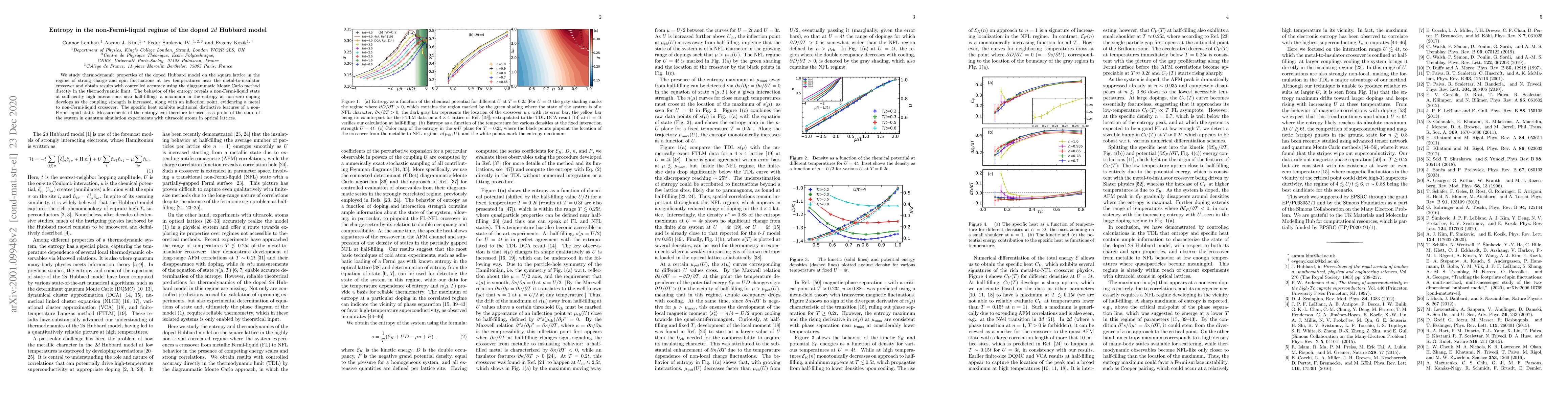 We study thermodynamic properties of the doped Hubbard model on the square lattice in the regime of strong charge and spin fluctuations at low temperatures near the metal-to-insulator crossover and obtain results with controlled accuracy using the diagrammatic Monte Carlo method directly in the thermodynamic limit. The behavior of the entropy reveals a non-Fermi-liquid state at sufficiently high interactions near half-filling: a maximum in the entropy at non-zero doping develops as the coupling strength is increased, along with an inflection point, evidencing a metal to non-Fermi-liquid crossover. The specific heat exhibits additional distinctive features of a non-Fermi-liquid state. Measurements of the entropy can therefore be used as a probe of the state of the system in quantum simulation experiments with ultracold atoms in optical lattices.