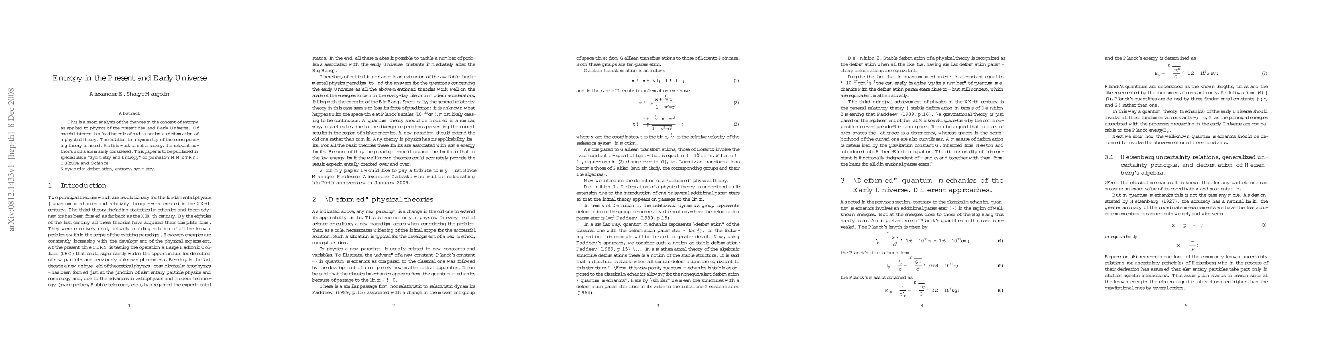 This is a short analysis of the changes in the concept of entropy as applied to physics of the present-day and Early Universe. Of special interest is a leading role of such a notion as deformation of a physical theory. The relation to a symmetry of the corresponding theory is noted. As this work is not a survey, the relevant author's works are mainly considered. This paper is to be published in special issue "Symmetry and Entropy" of journal SYMMETRY: Culture and Science