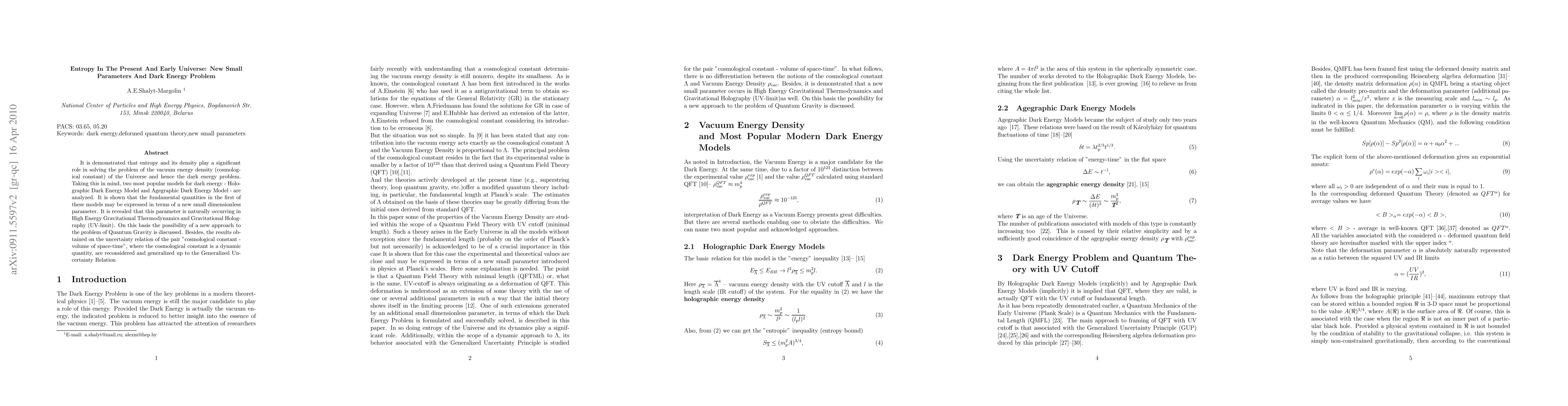It is demonstrated that entropy and its density play a significant role in solving the problem of the vacuum energy density (cosmological constant) of the Universe and hence the dark energy problem. Taking this in mind, two most popular models for dark energy - Holographic Dark Energy Model and Agegraphic Dark Energy Model - are analyzed. It is shown that the fundamental quantities in the first of these models may be expressed in terms of a new small dimensionless parameter. It is revealed that this parameter is naturally occurring in High Energy Gravitational Thermodynamics and Gravitational Holography (UV-limit). On this basis the possibility of a new approach to the problem of Quantum Gravity is discussed. Besides, the results obtained on the uncertainty relation of the pair "cosmological constant - volume of space-time", where the cosmological constant is a dynamic quantity, are reconsidered and generalized up to the Generalized Uncertainty Relation.