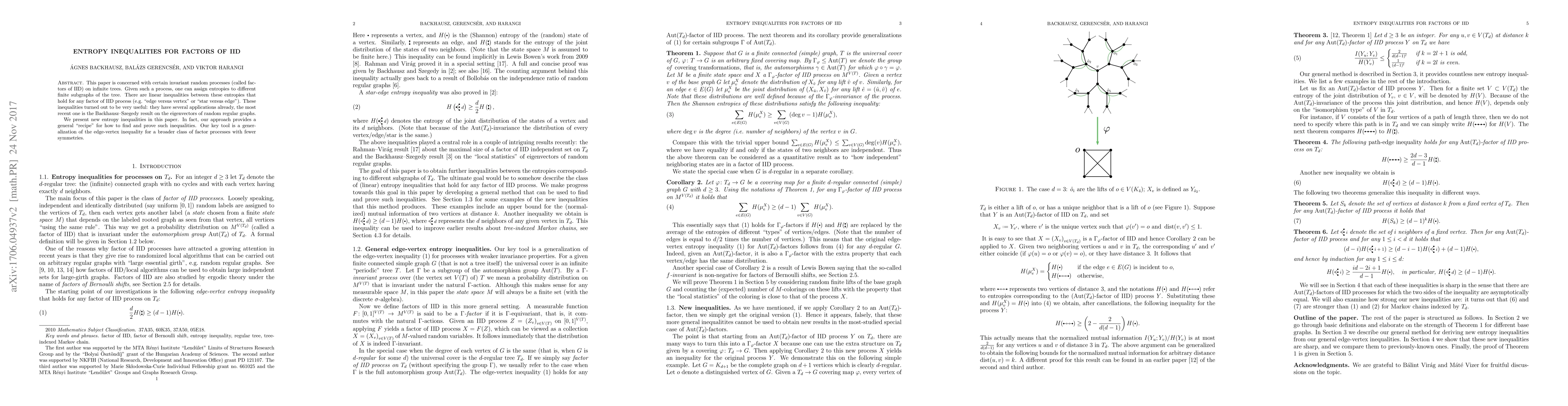 This paper is concerned with certain invariant random processes (called factors of IID) on infinite trees. Given such a process, one can assign entropies to different finite subgraphs of the tree. There are linear inequalities between these entropies that hold for any factor of IID process (e.g. "edge versus vertex" or "star versus edge"). These inequalities turned out to be very useful: they have several applications already, the most recent one is the Backhausz-Szegedy result on the eigenvectors of random regular graphs. We present new entropy inequalities in this paper. In fact, our approach provides a general "recipe" for how to find and prove such inequalities. Our key tool is a generalization of the edge-vertex inequality for a broader class of factor processes with fewer symmetries.