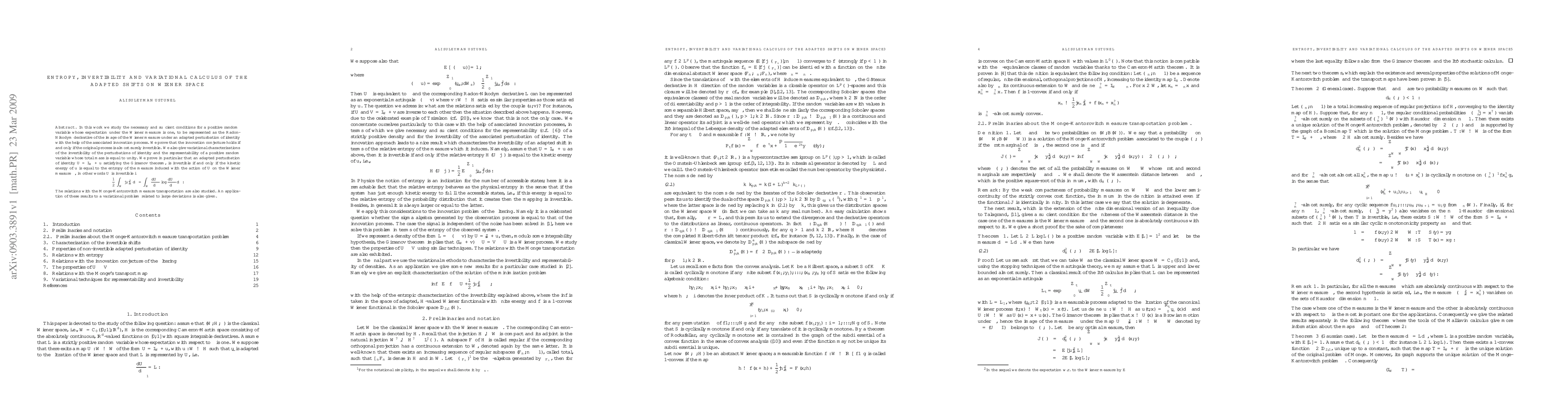 In this work we study the necessary and sufficient conditions for a positive random variable whose expectation under the Wiener measure is one, to be represented as the Radon-Nikodym derivative of the image of the Wiener measure under an adapted perturbation of identity with the help of the associated innovation process. We prove that the innovation conjecture holds if and only if the original process is almost surely invertible. We also give variational characterizations of the invertibility of the perturbations of identity and the representability of a positive random variable whose total mass is equal to unity. We prove in particular that an adapted perturbation of identity $U=I_W+u$ satisfying the Girsanov theorem, is invertible if and only if the kinetic energy of $u$ is equal to the entropy of the measure induced with the action of $U$ on the Wiener measure $\mu$, in other words $U$ is invertible iff $$ \half \int_W|u|_H^2d\mu=\int_W \frac{dU\mu}{d\mu}\log\frac{dU\mu}{d\mu}d\mu >. $$ otherwise the l.h.s. is always strictly greater than the r.h.s. The relations with the Monge-Kantorovitch measure transportation are also studied. An application of these results to a variational problem related to large deviations is also given.