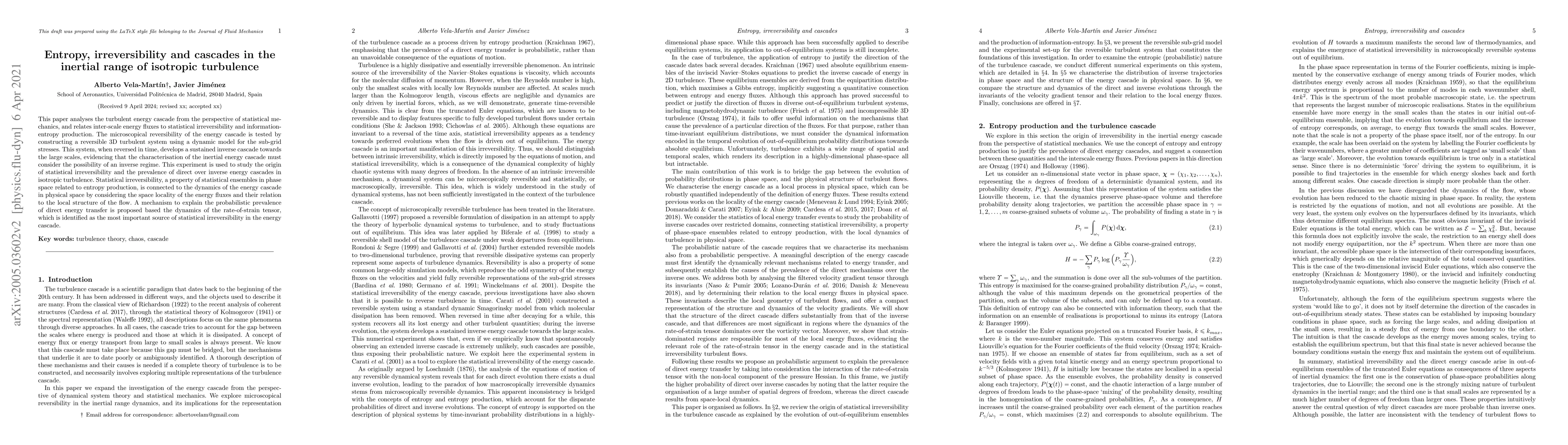 This paper investigates the turbulent energy cascade in isotropic turbulence, linking inter-scale energy fluxes to statistical irreversibility and entropy production. The study proposes a reversible turbulent system that, when reversed, reveals a sustained inverse cascade, suggesting a probabilistic dominance of direct energy transfer driven by the dynamics of the rate-of-strain tensor.