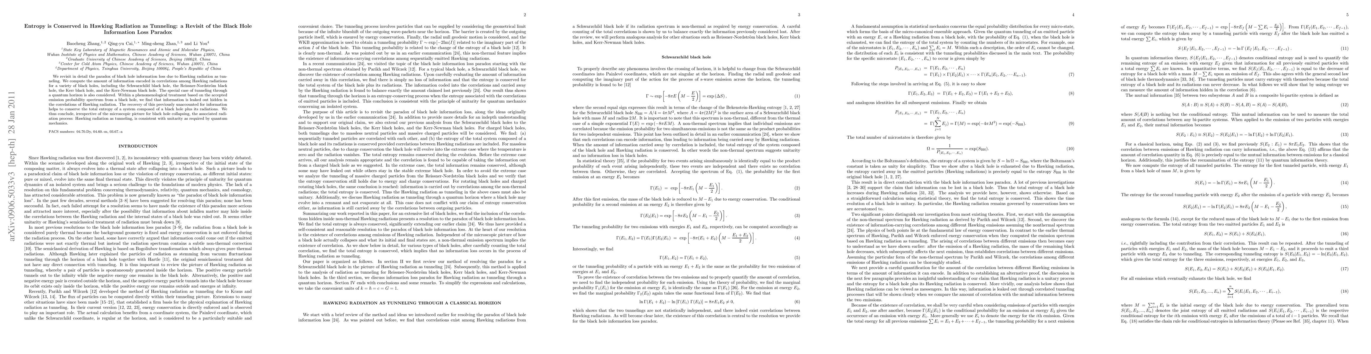 This paper investigates the black hole information loss paradox by analyzing Hawking radiation as tunneling, demonstrating that information encoded in the correlations of Hawking radiation preserves total entropy, thus supporting quantum mechanical unitarity. The study considers various black hole types and concludes that the radiation process conserves entropy and information.