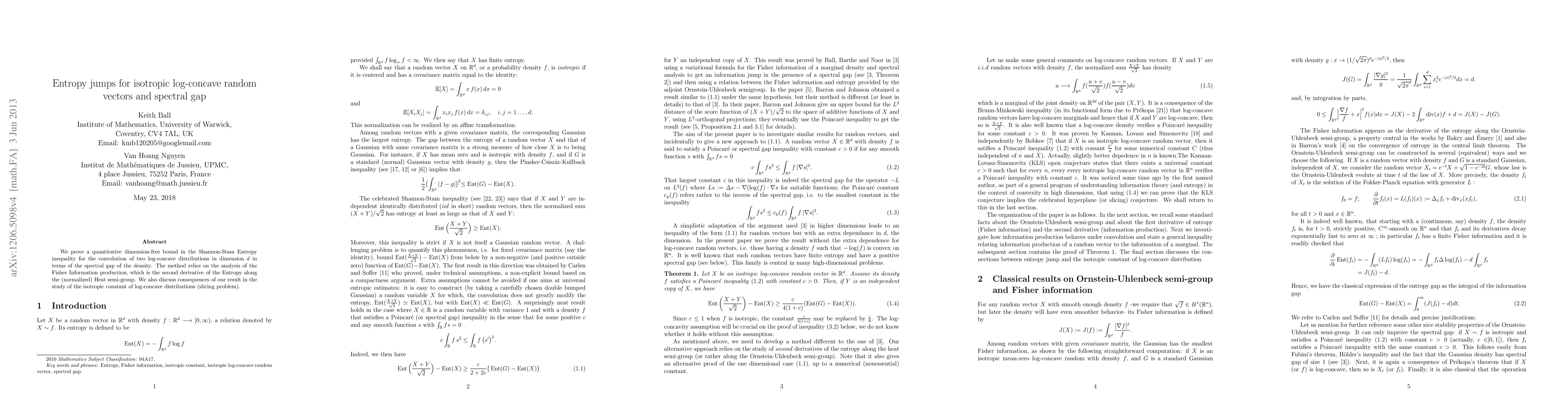 This paper establishes a dimension-free bound for the Shannon-Stam Entropy inequality concerning the convolution of two log-concave distributions, linking it to the spectral gap of the density. The analysis employs the Fisher Information production, and it discusses implications for the isotropic constant in the slicing problem.